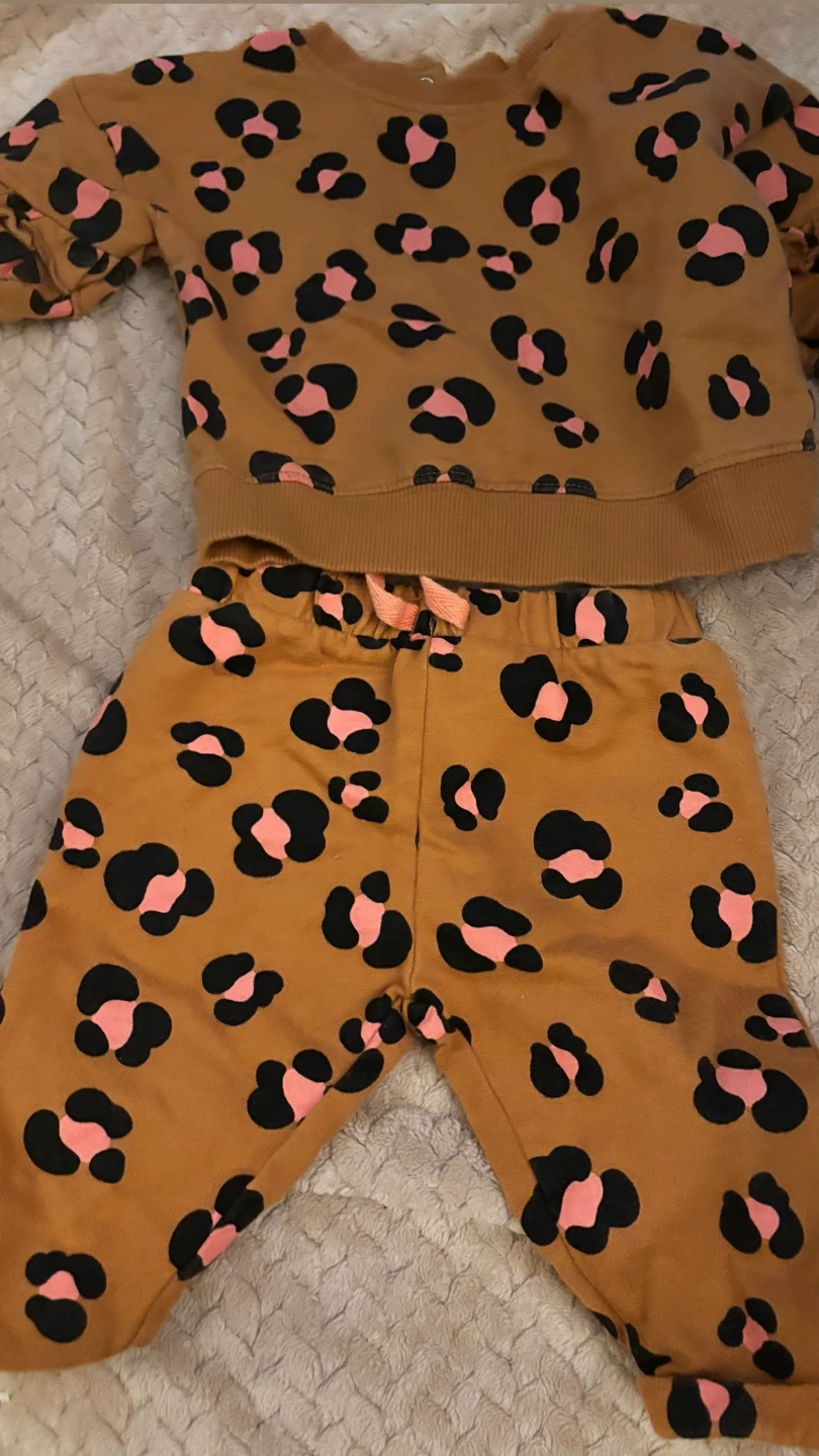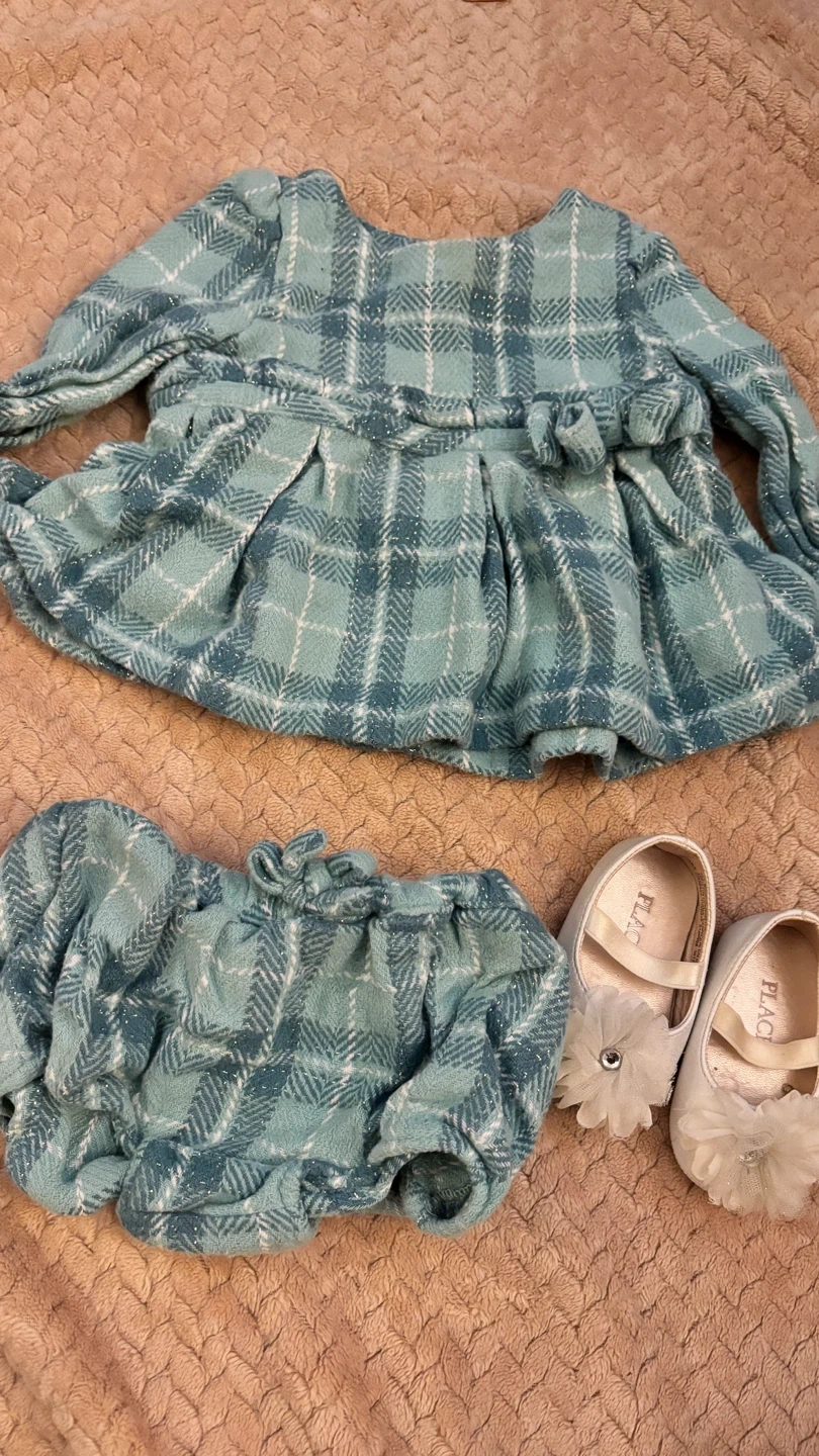 This adorable baby girls outfit features a plaid print dress with bloomers and a matching pair of white shoes. The leopard print tracksuit includes a long-sleeved top and matching pants. Perfect for your little one's wardrobe!