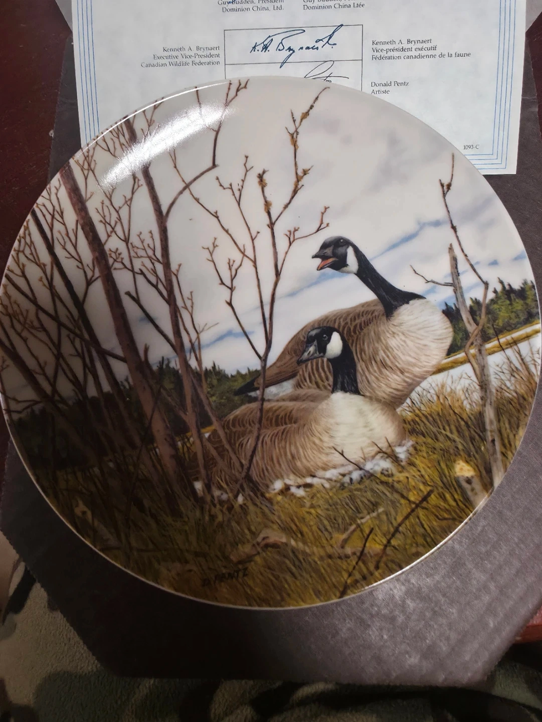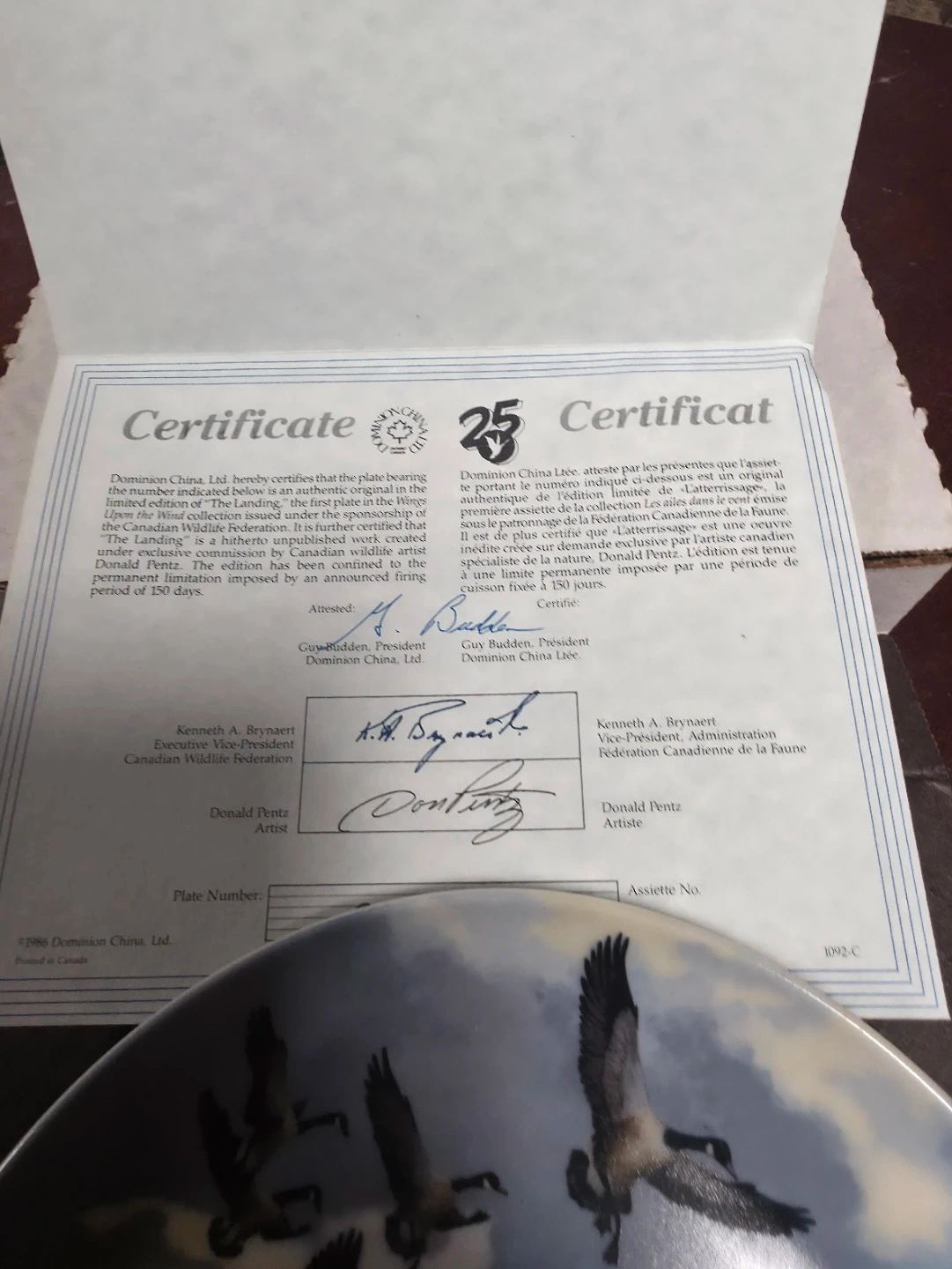 This is the first issue in the "Upon the Wind" collection, "The Landing" by artist Donald Pentz. It's made of fine china, plate number 1092-C. This limited edition plate was produced by Dominion China Ltd. in 1986. It comes with a certificate of authenticity from the Canadian Wildlife Federation.