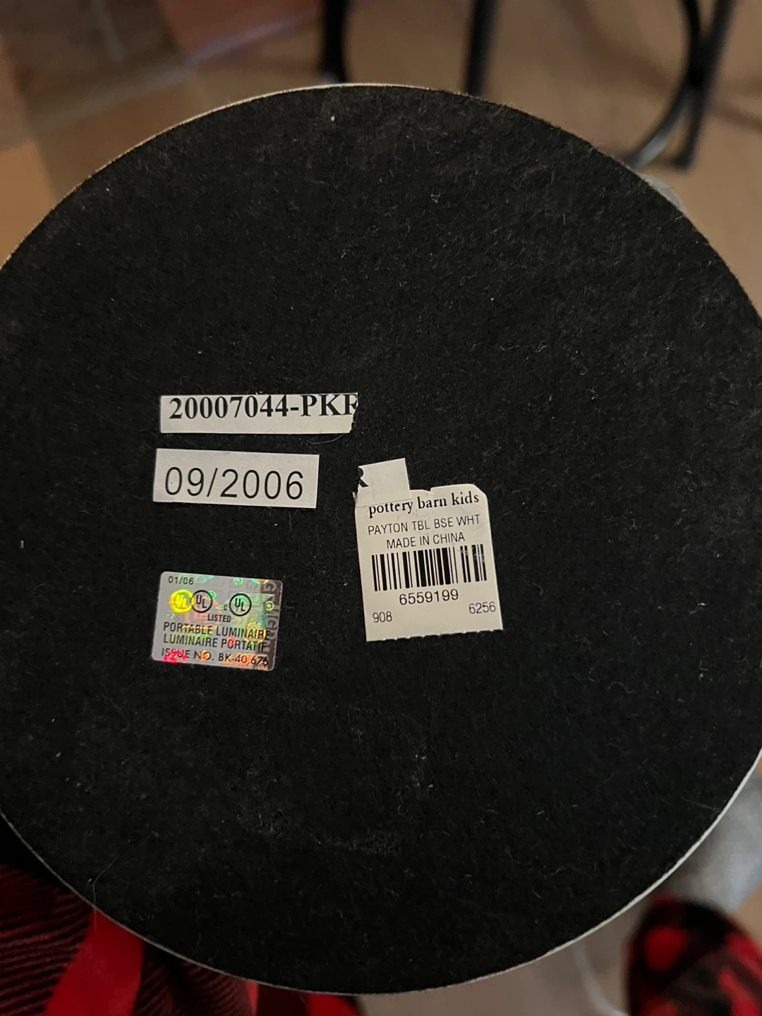 White table lamp with a bright green lampshade. It's a Pottery Barn Kids Payton model. This lamp is great for a child's bedroom or playroom!