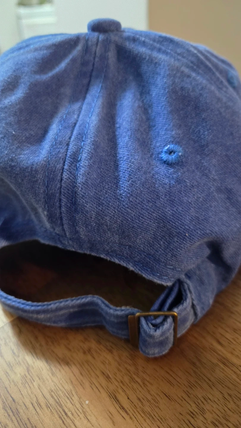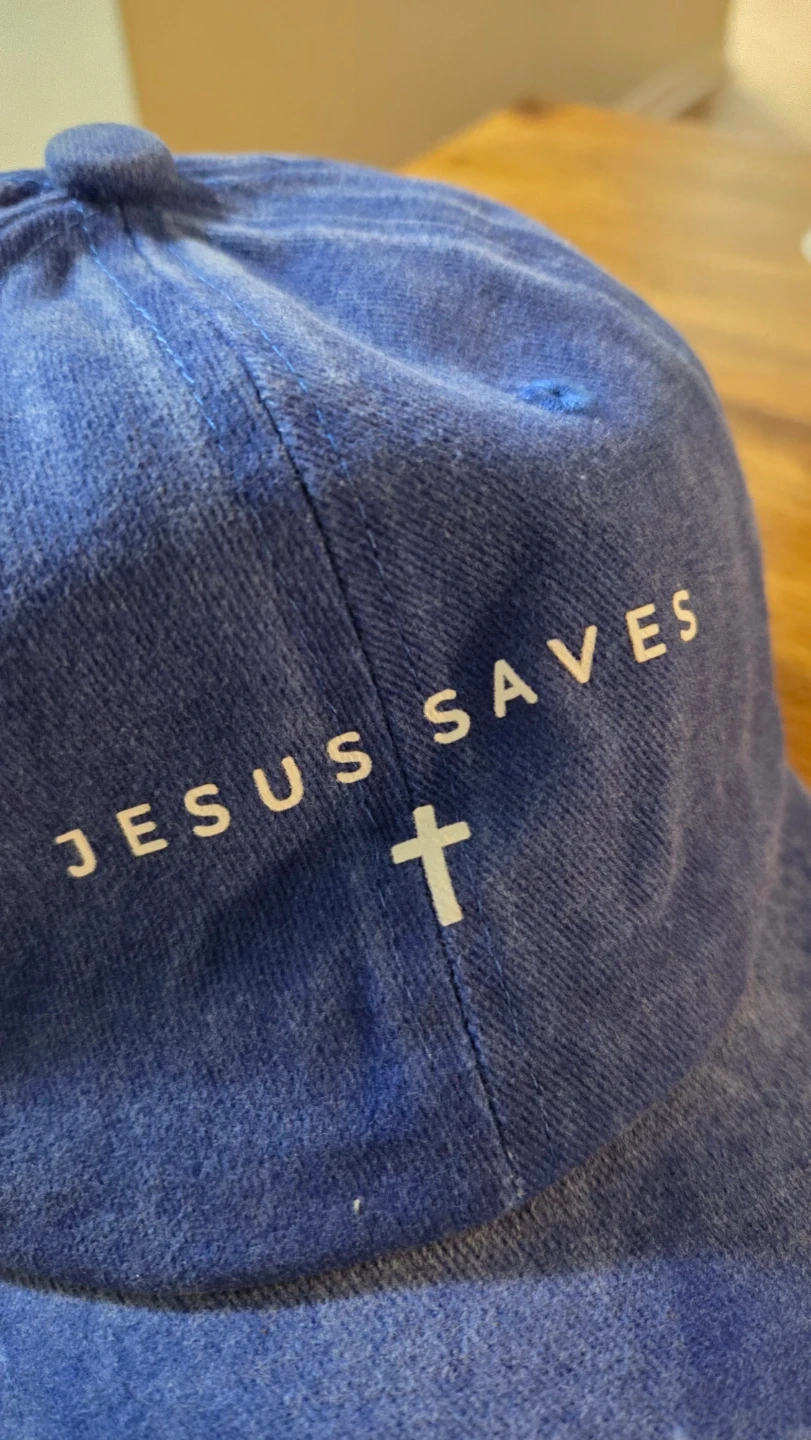 This is a cool blue Cap with Jesus Saves logo. Can be worn by male or female. It's brand new and I have it as extra. Denim-like material, and has an adjustable strap in back with a metal buckle. Great for everyday wear. Please don't ask for a lower price.