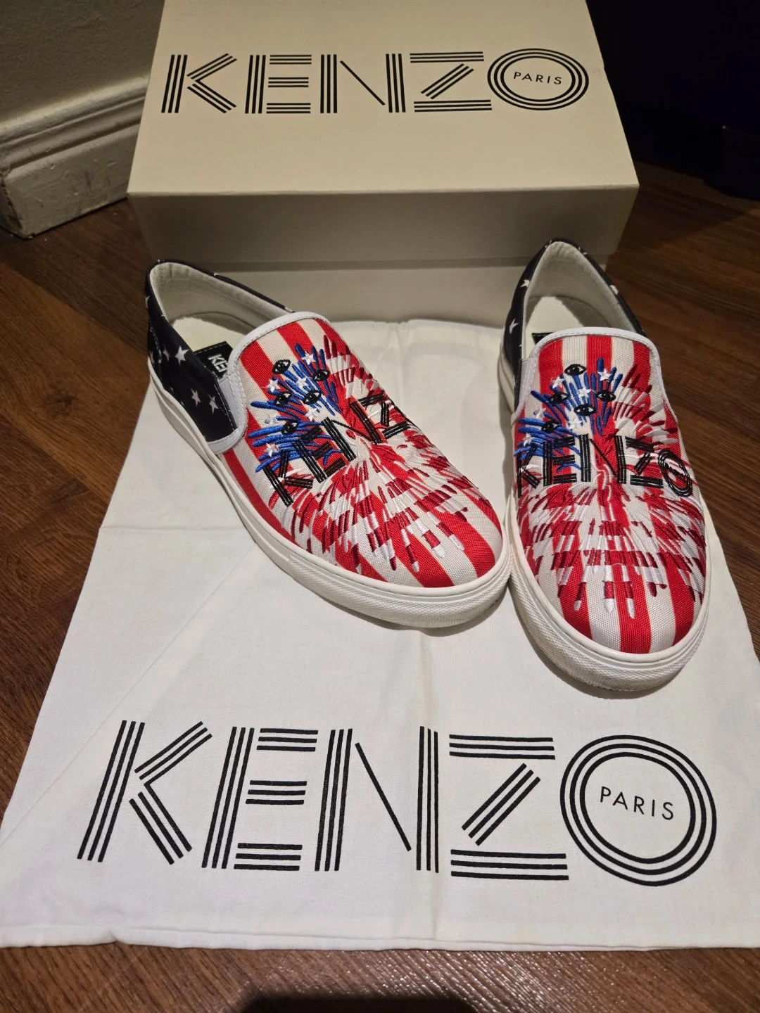 KENZO Paris slip-on shoes with a red, white, and blue firework and star pattern. Includes original box and dust bag. These shoes are perfect for 4th of July!