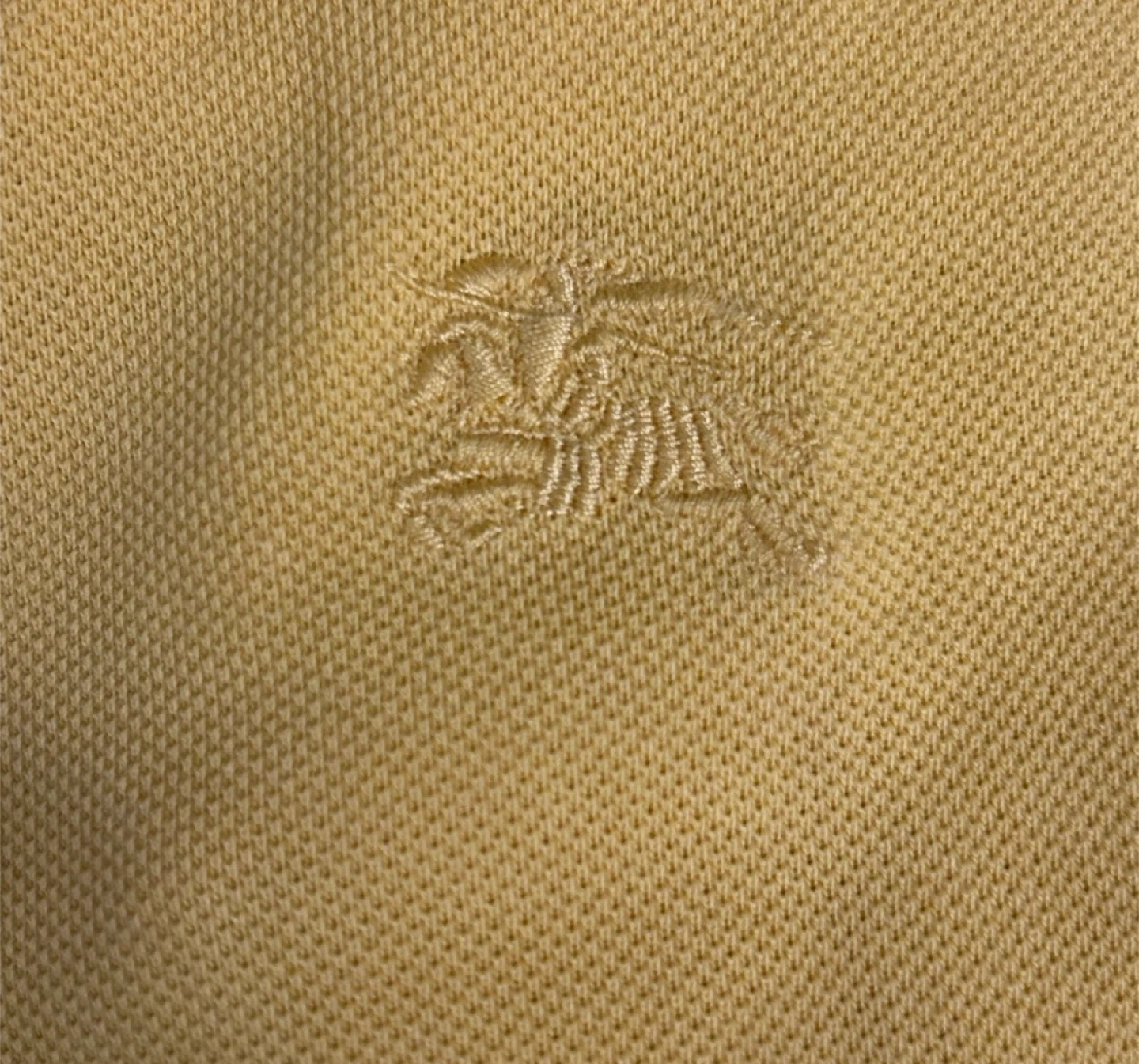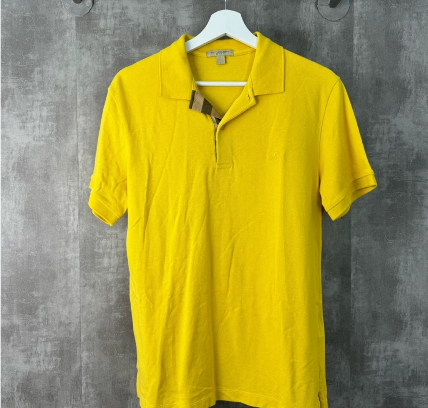 Burberry Brit polo shirt in a bright yellow. It's made from 100% cotton for comfort. This shirt features the iconic Burberry Equestrian Knight emblem subtly embroidered on the chest. Size medium.u