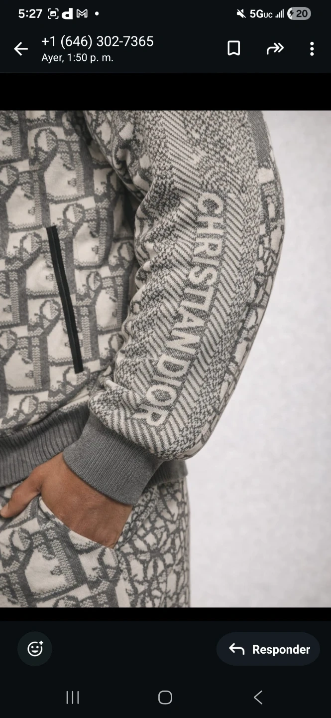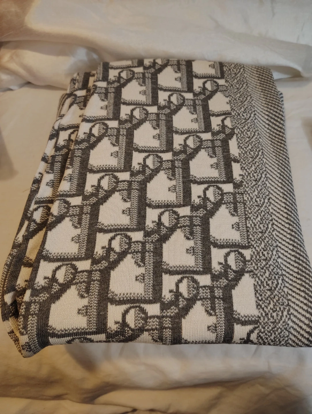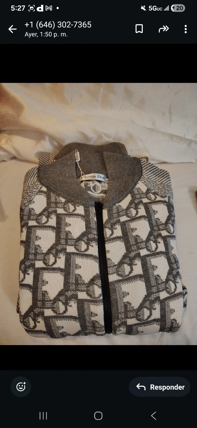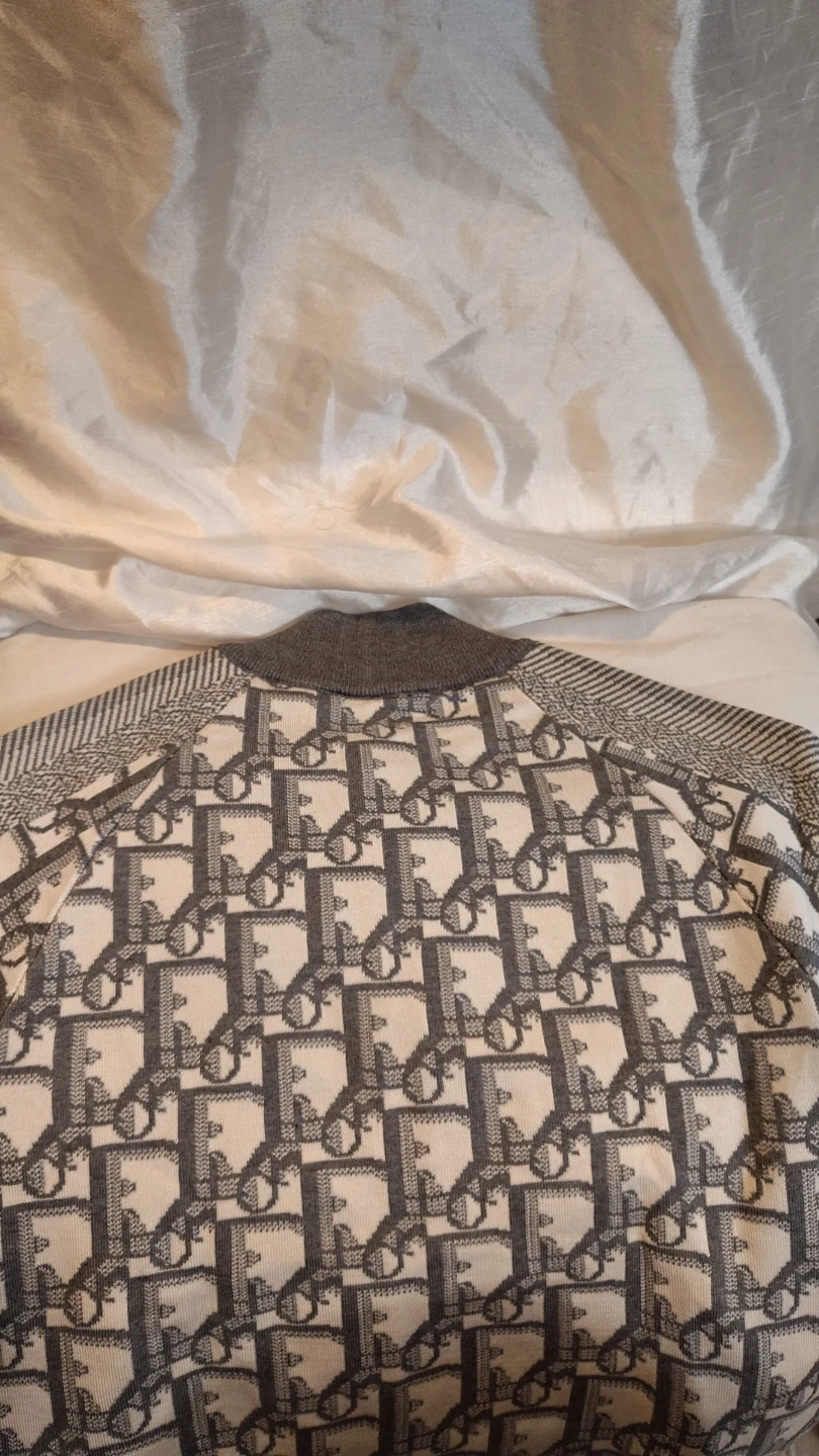 This Christian Dior bomber jacket features the iconic monogram print. It's made from a knit material with a zip-up front and ribbed collar, cuffs, and hem. Size M.