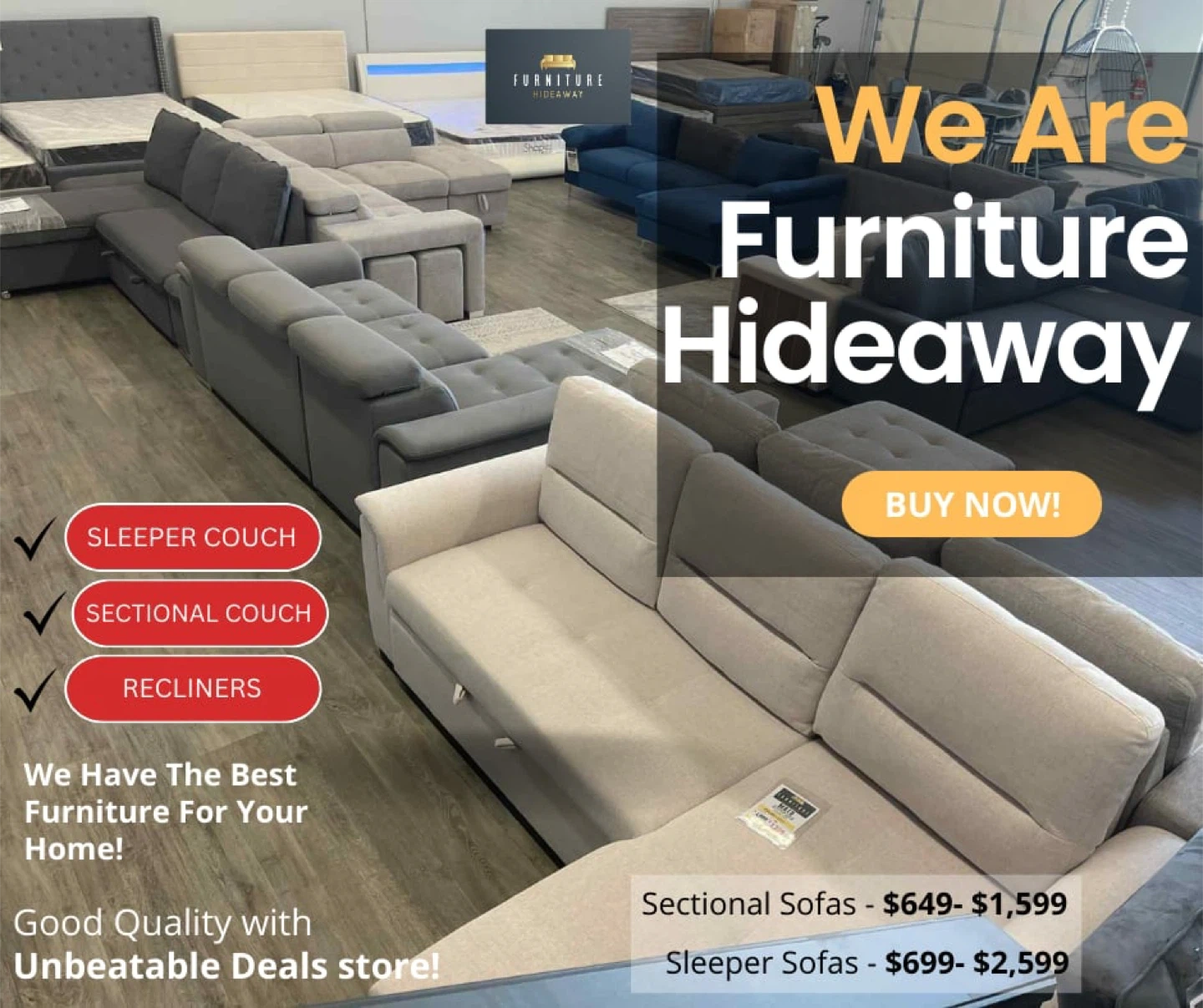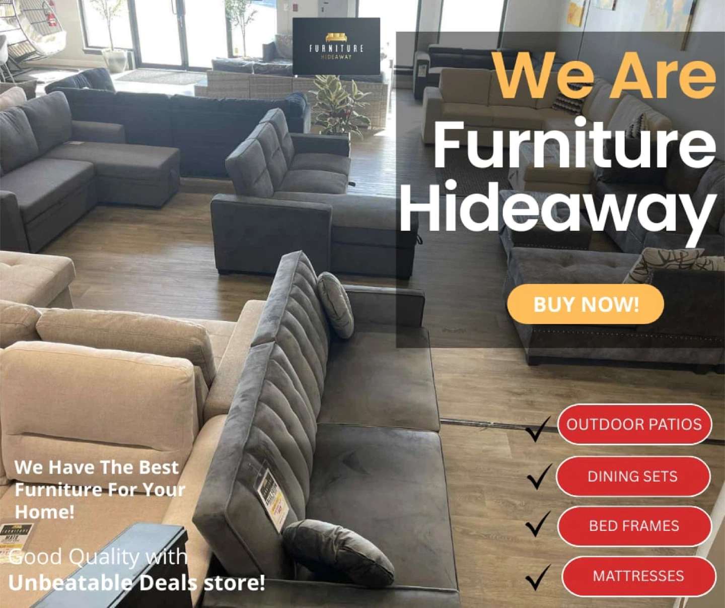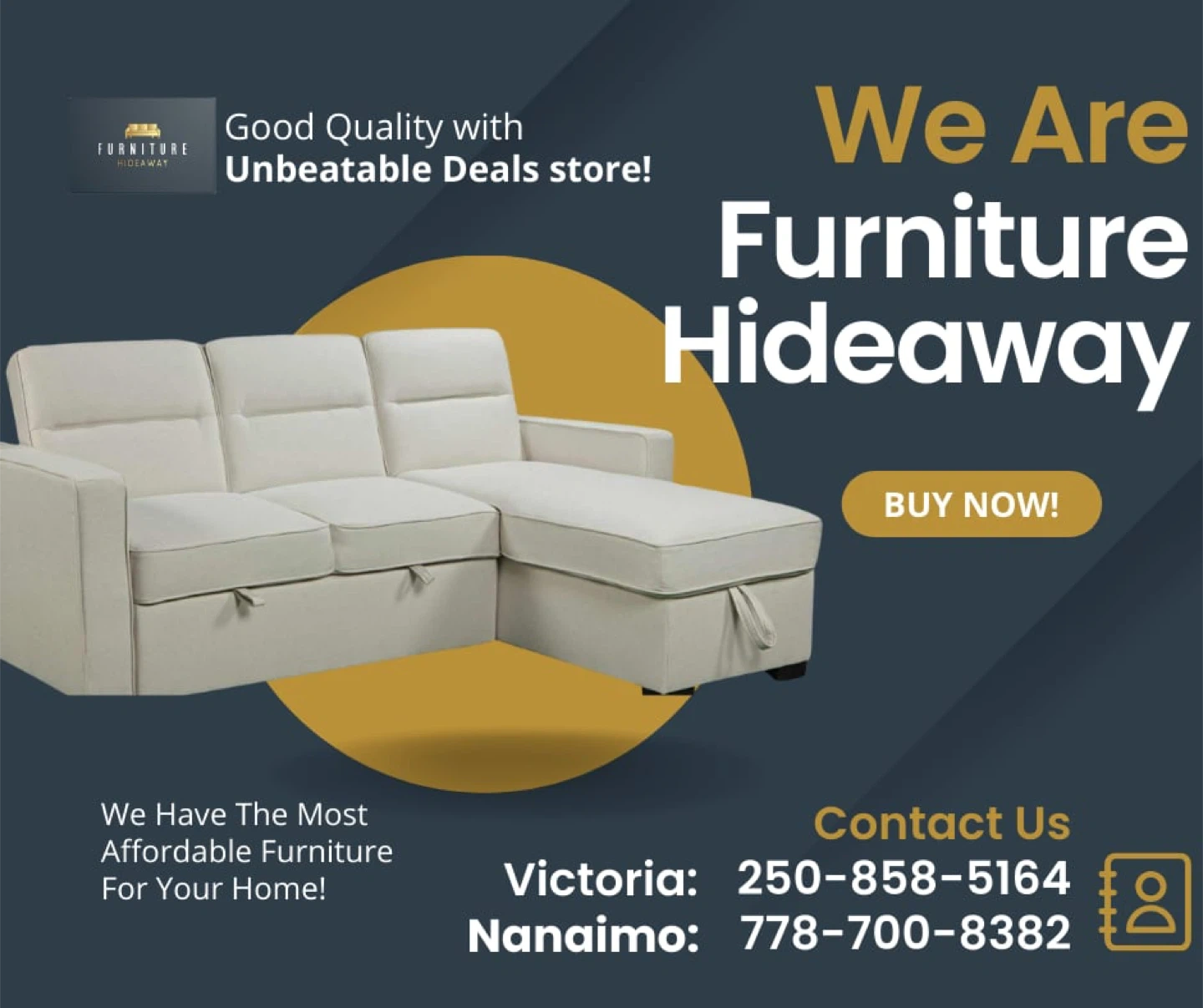 20Discover unbeatable prices on good-quality furniture at our Victoria and Nanaimo showrooms!🛋️✨ Visit us to explore exclusive deals you won’t find anywhere else in town. Sale Price‼️ 🔥Sectional sofas starts at $649 🔥Sleeper Sofas starts at $699 🔥Dining Sets starts at $599 🔥Outdoor Patios starts at $799 🔥Bed Frames starts at $249 🔥Mattresses start at $199 Feel free to visit our showroom: 📍Victoria: Unit 206-314 Wale Rd Colwood Phone: 250-858-5164 Open daily: ⏰Mon-Friday: 11am-7pm ⏰Weekends: 10am-6pm ⏰Holidays ** 11am-5pm** 📍Nanaimo: Unit E -2231 Mcgarrigle Rd, Nanaimo Phone : 778-700-8382 ⏰Monday- CLOSED ⏰Tuesday to Sunday: 10am-6pm We can’t wait to assist you! See you soon 💫 www.furniturehideaway.ca