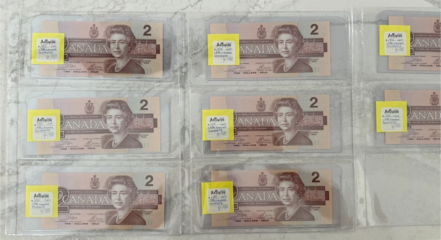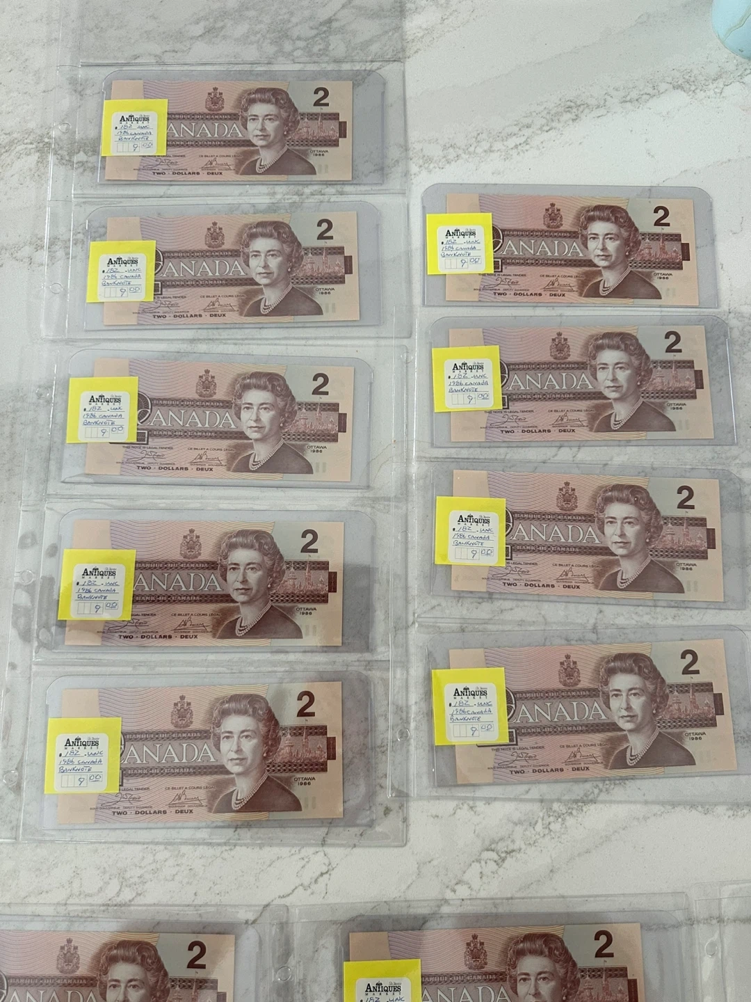 15FOR SALE: Twelve 1986 Uncirculated & Sequential Canadian two-dollar bills. Each bill is in great condition and in a protective sleeve. A great addition to any collection! Take all 12 bills for $110.00. Will consider selling them apart BUT keeping the sequence notes together.