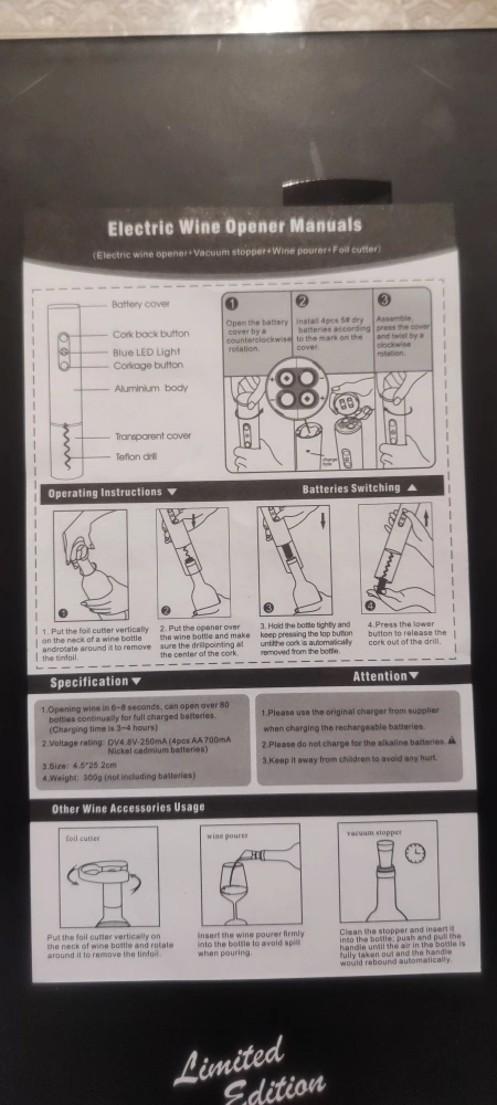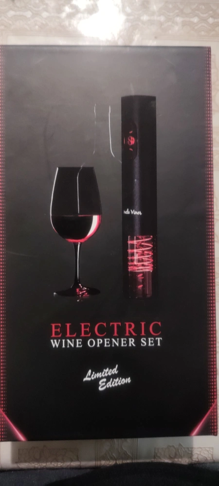 123Electric wine opener set. Includes wine pourer, foil cutter, and vacuum stopper. Limited edition. New, unopened box. Batteries and charger included. Never used.