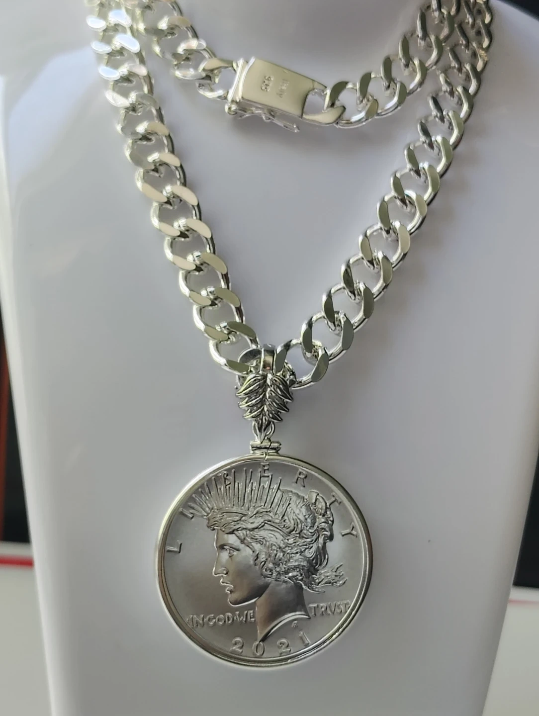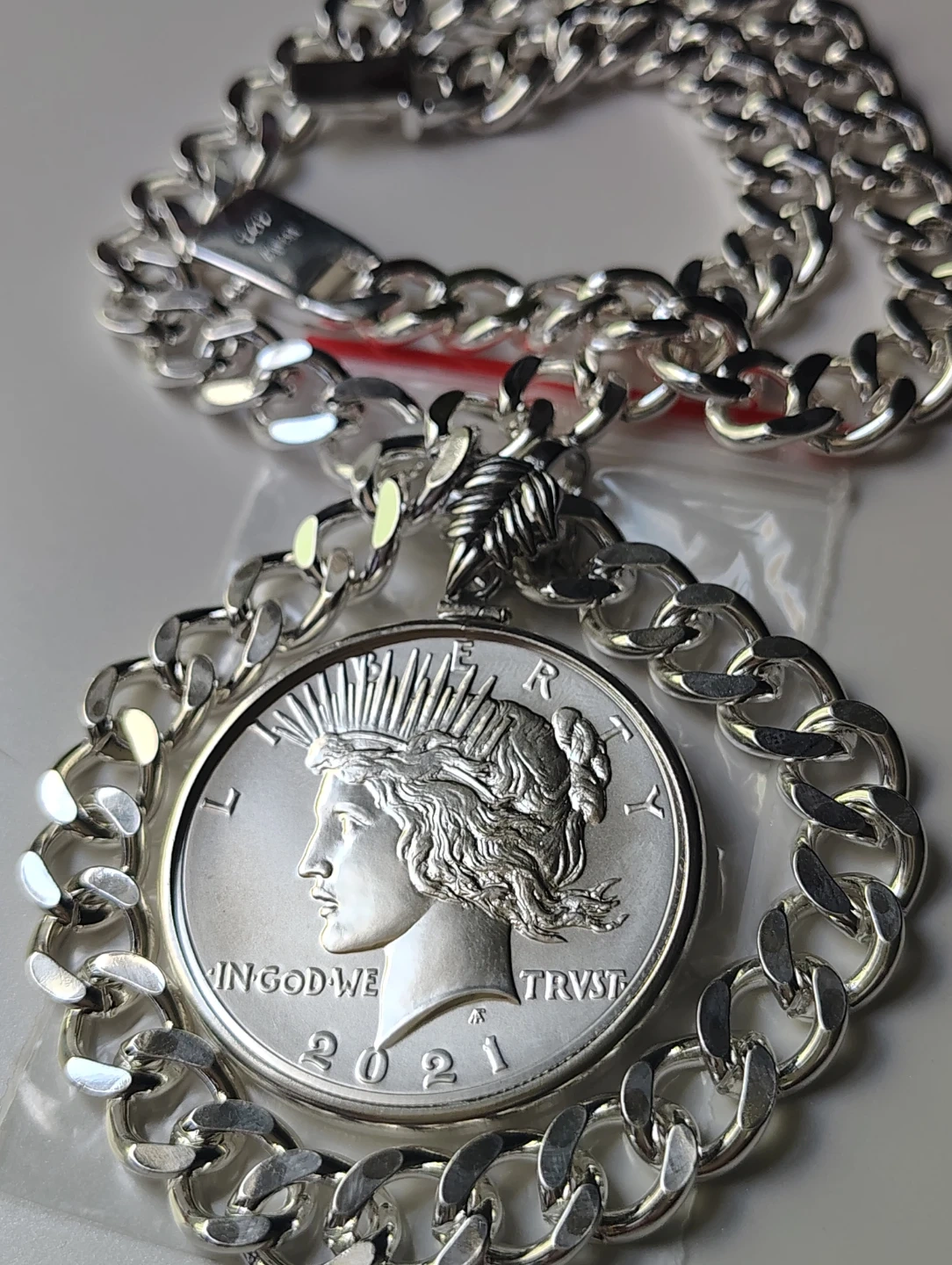 Collar plateado brillante y único con silver Peace dollar 2021 . Moneda de colección 100 años aniversario. Certificado MS 69 NGC.una verdadera joya numismatico.