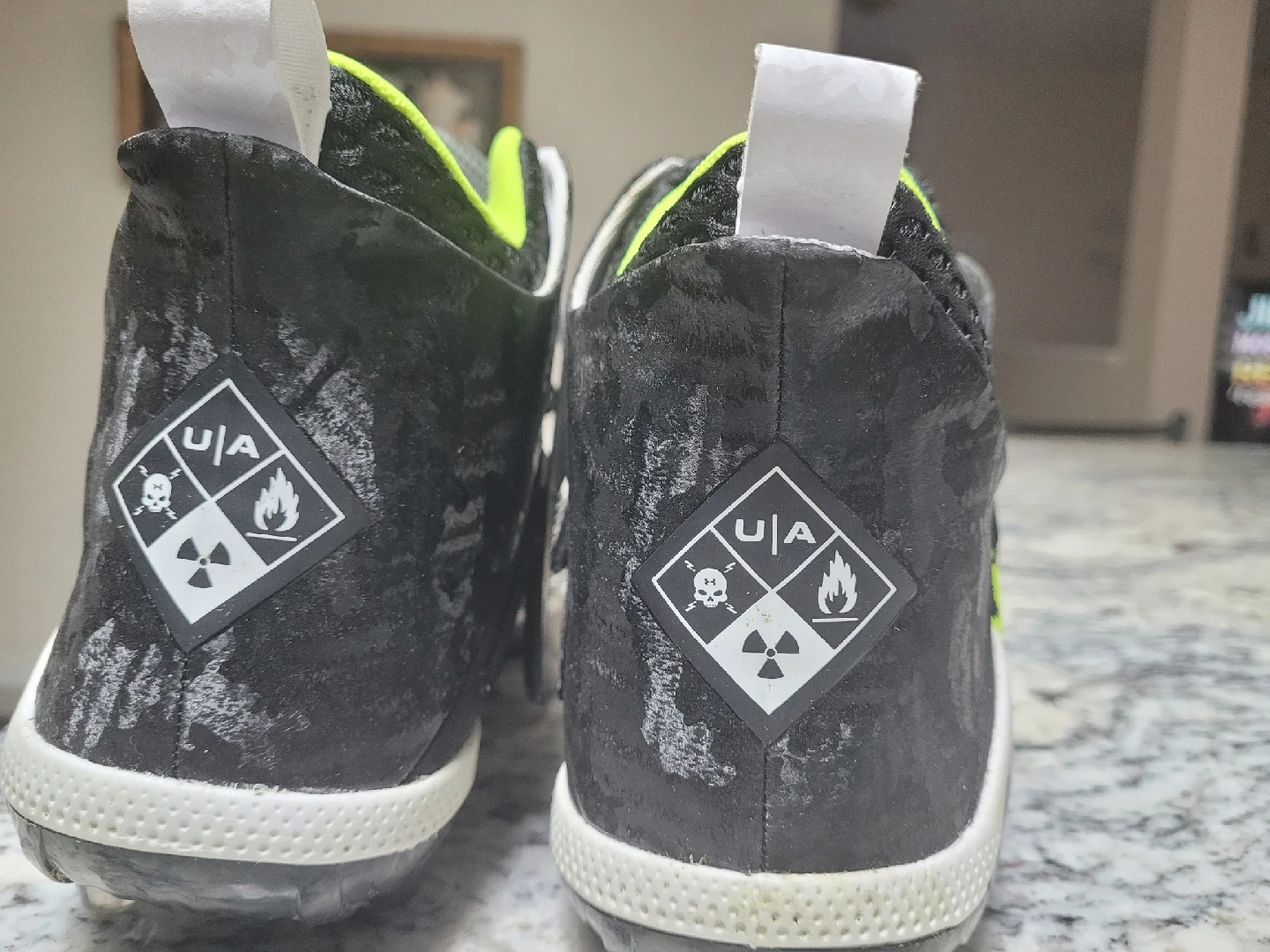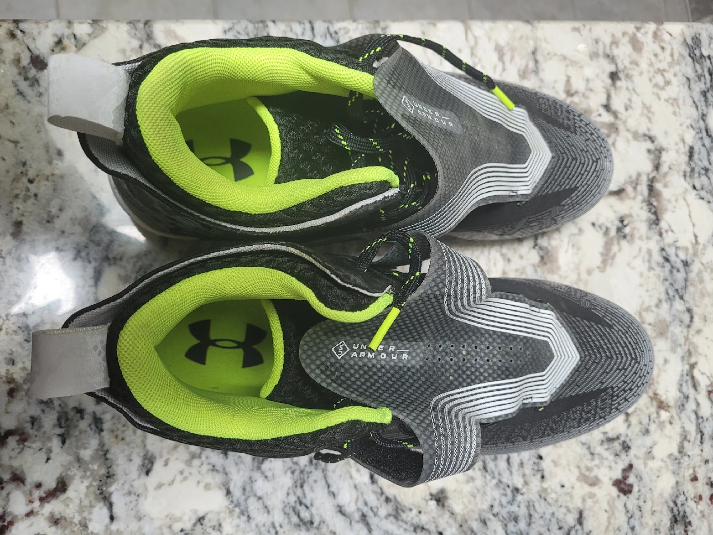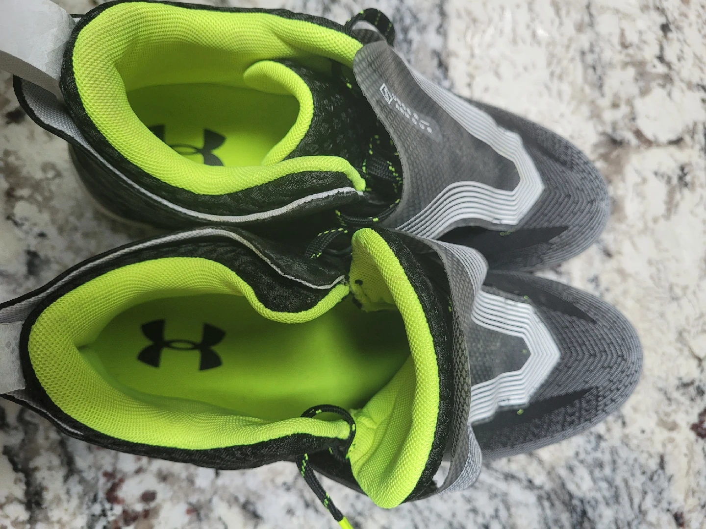 15Selling a pair of Under Armour baseball cleats in size 11.5 US. They feature a unique design with a black and grey upper and vibrant neon green accents on the interior and laces. Perfect for the baseball season!