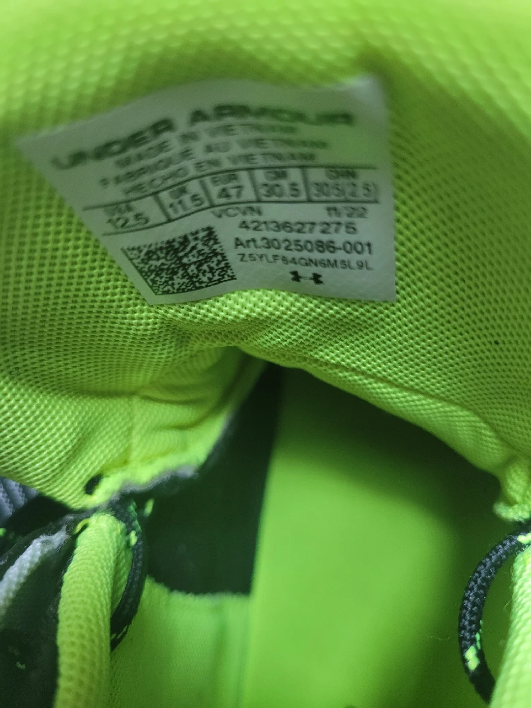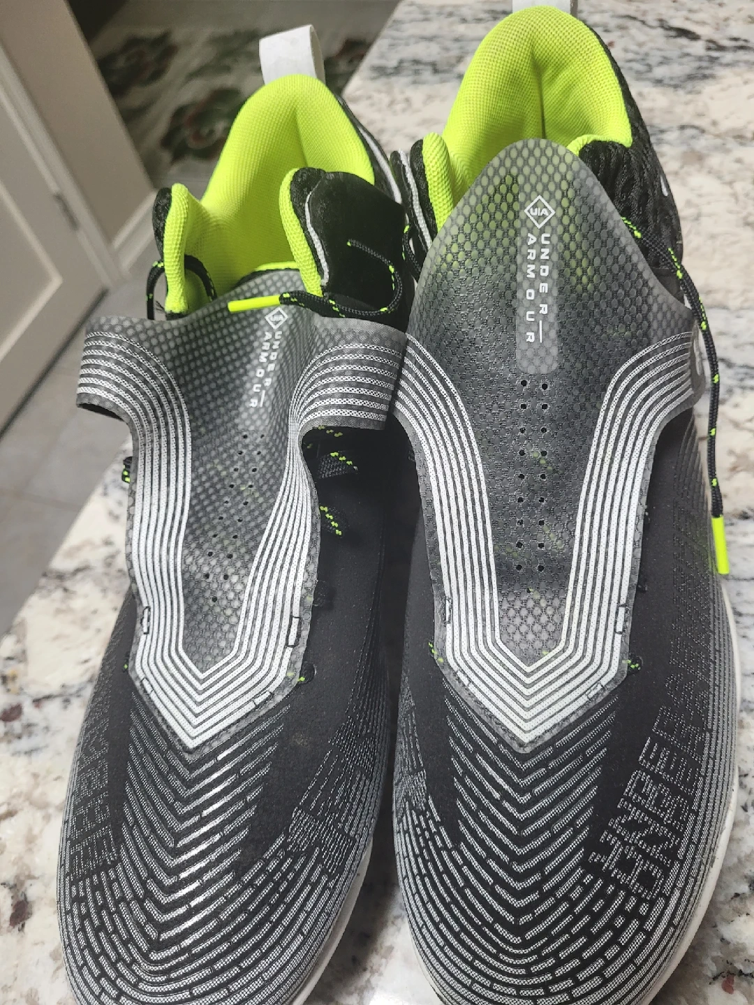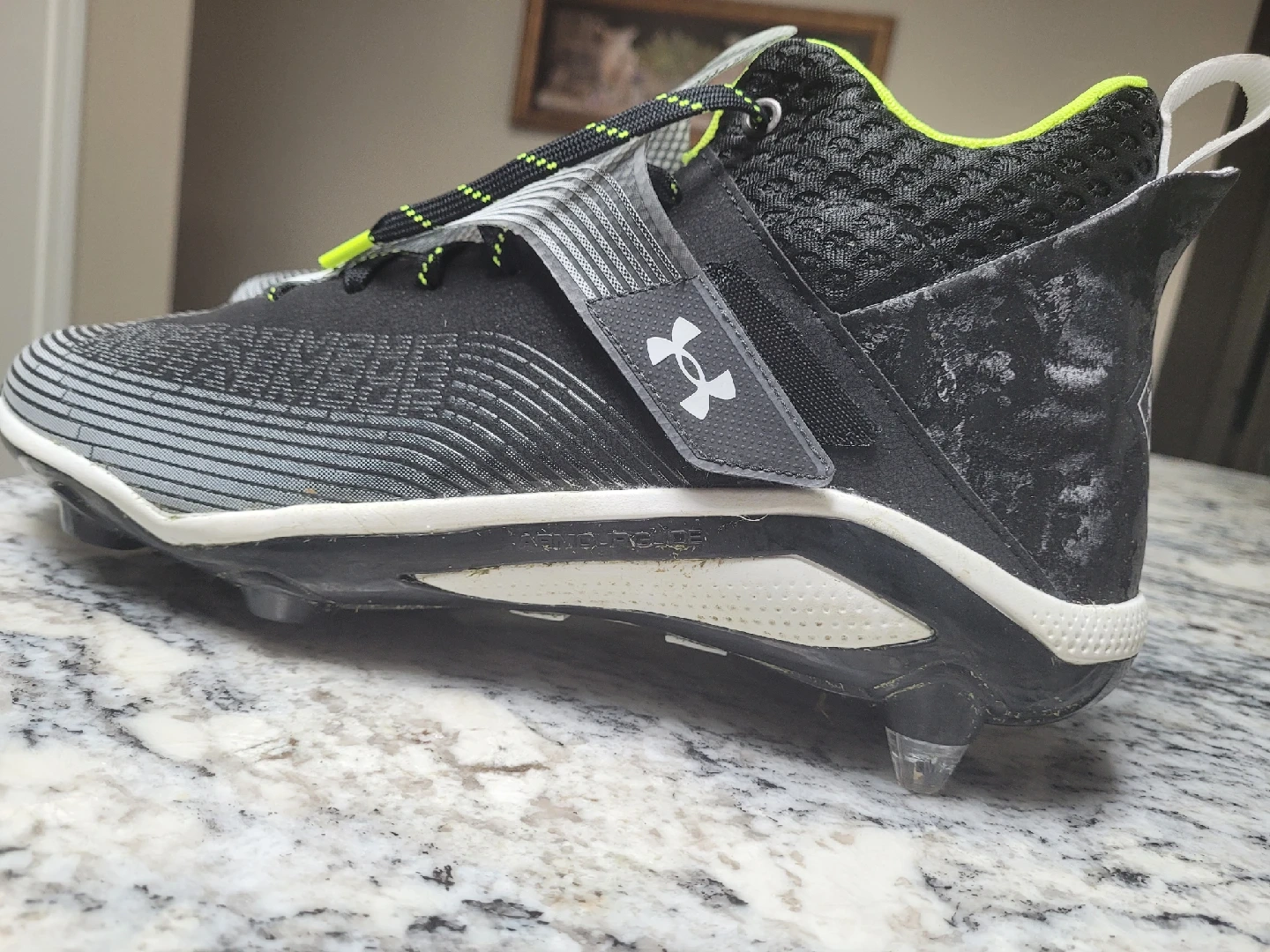 15Selling a pair of Under Armour baseball cleats in size 11.5 US. They feature a unique design with a black and grey upper and vibrant neon green accents on the interior and laces. Perfect for the baseball season!