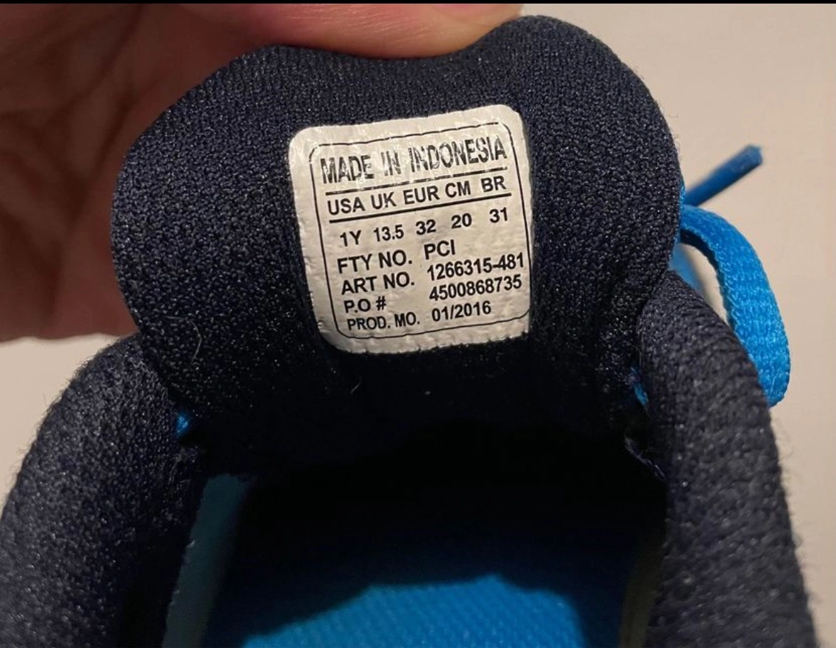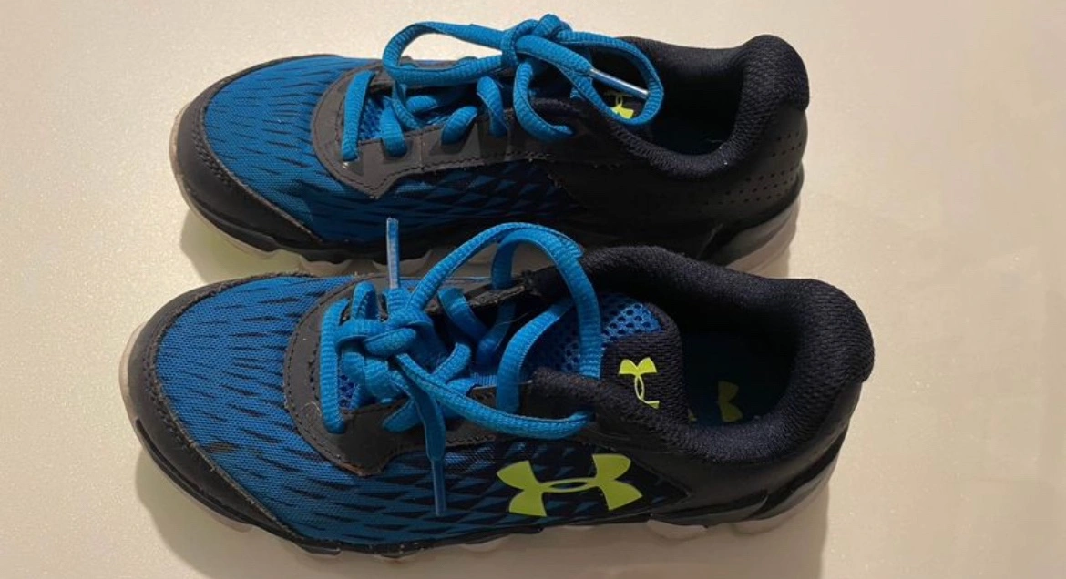 16Blue and black running shoes with blue laces and a yellow Under Armour logo.