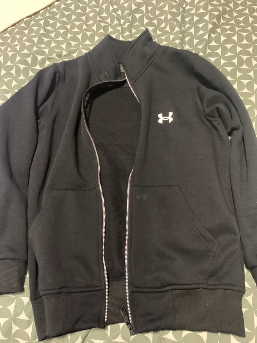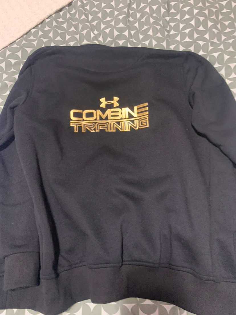 Black Under Armour Combine Training jacket with gold lettering on the back. It is a full zip jacket with a white logo on the front.