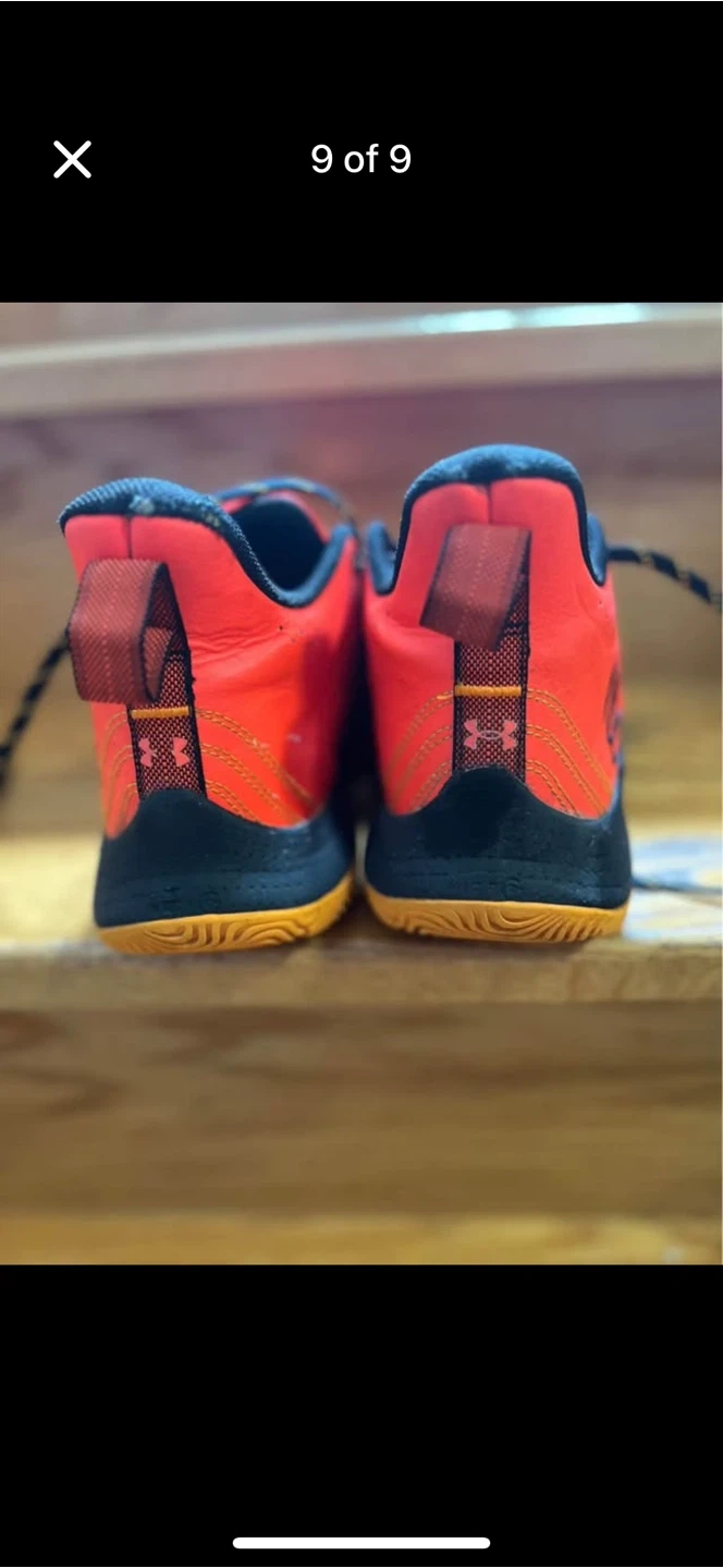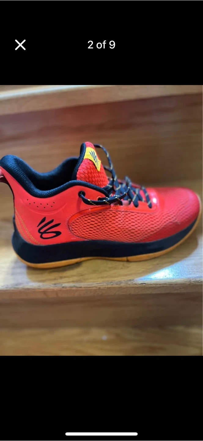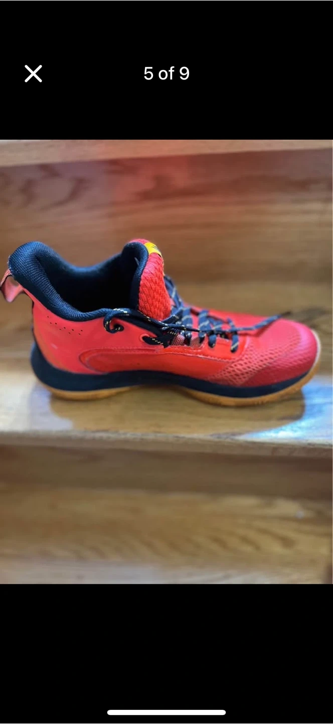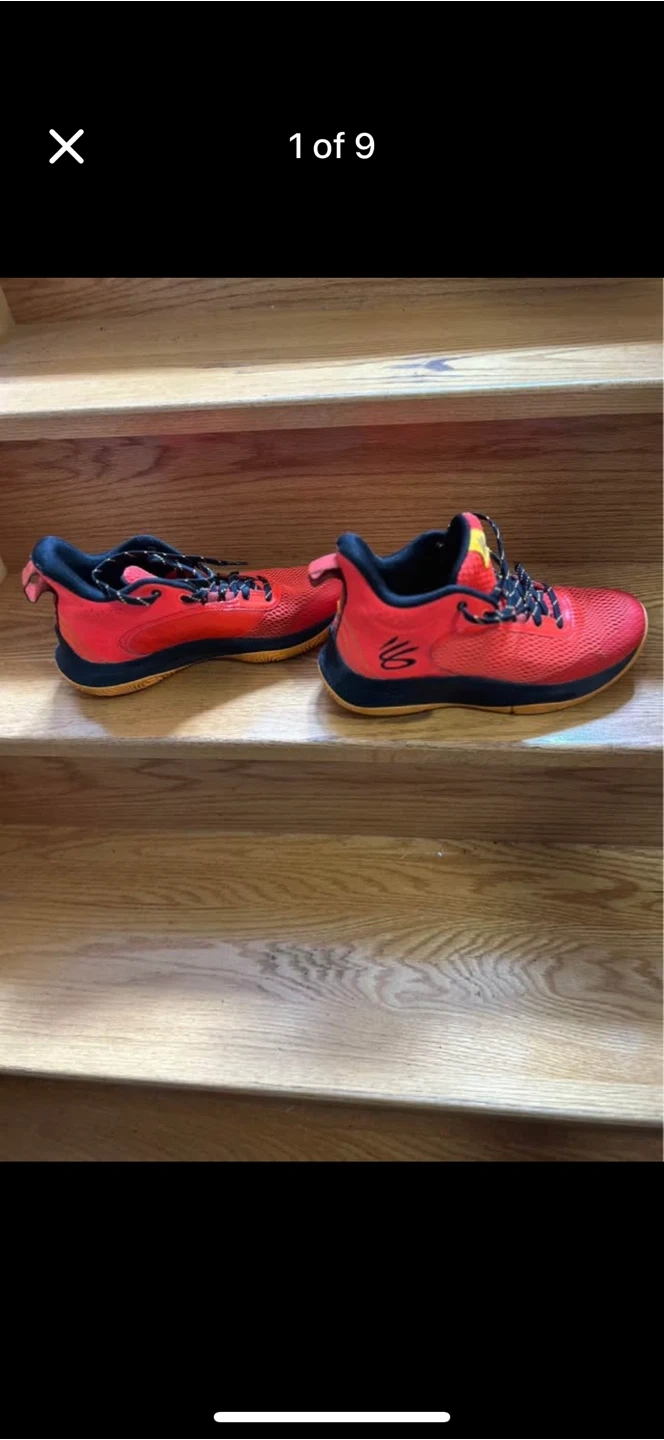 Selling a pair of Under Armour Curry 3Z6 basketball shoes in size mens 7 women 8.5 They're in great shape and ready for the court! The shoes feature a vibrant red colour with black accents. Perfect for anyone looking for a stylish and functional pair of basketball shoes