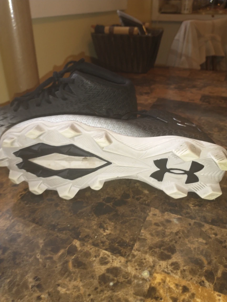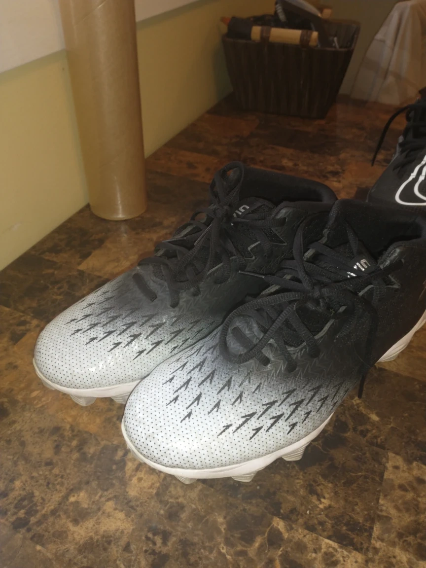60Selling a pair of Under Armour football cleats. They're in good condition with a stylish black and white gradient design. Perfect for hitting the field!