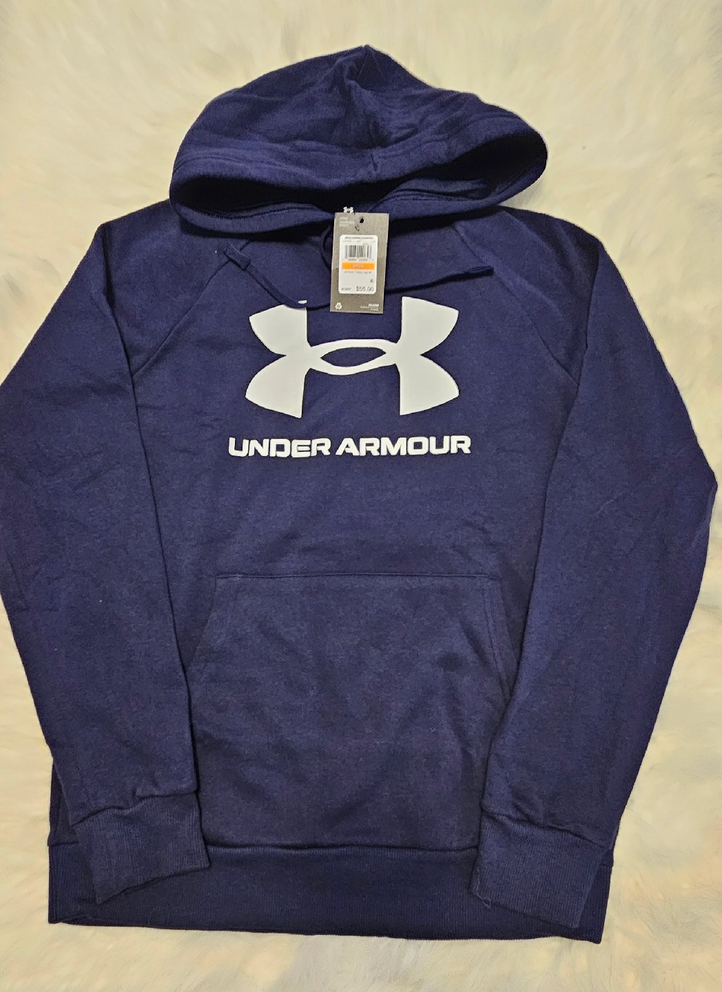 131Cozy Under Armour hoodie in a nice navy colour! It has the classic Under Armour logo on the front and a handy kangaroo pocket. Perfect for staying warm on chilly days! Colour: Midnight Navy/White