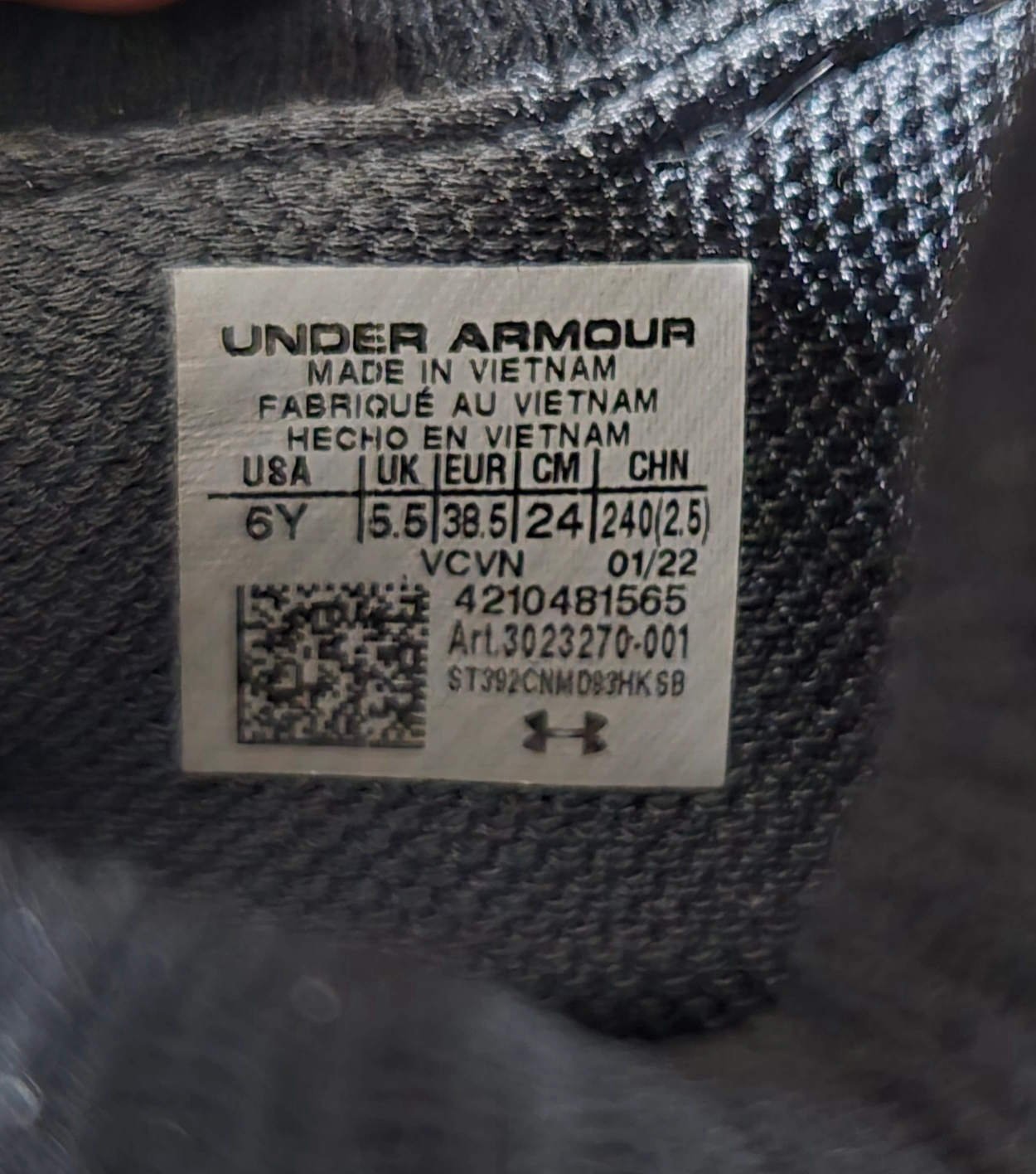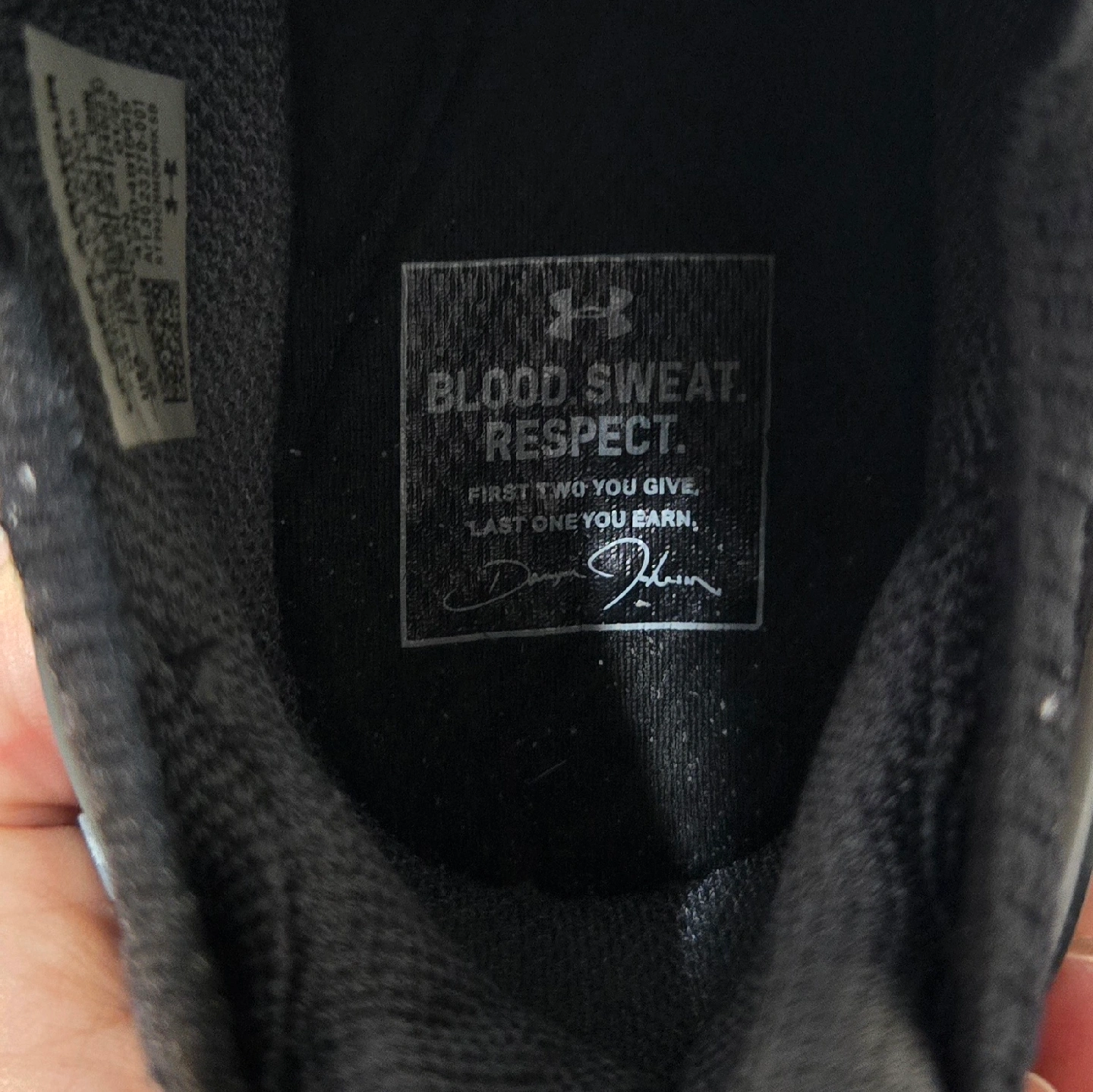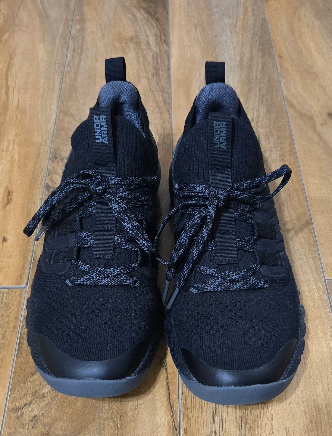 Selling a pair of Under Armour Project Rock training shoes in size 6Y, fits for size 36. They are in great condition, used once. The shoes are black and feature the Project Rock logo. Perfect for workouts or everyday wear.