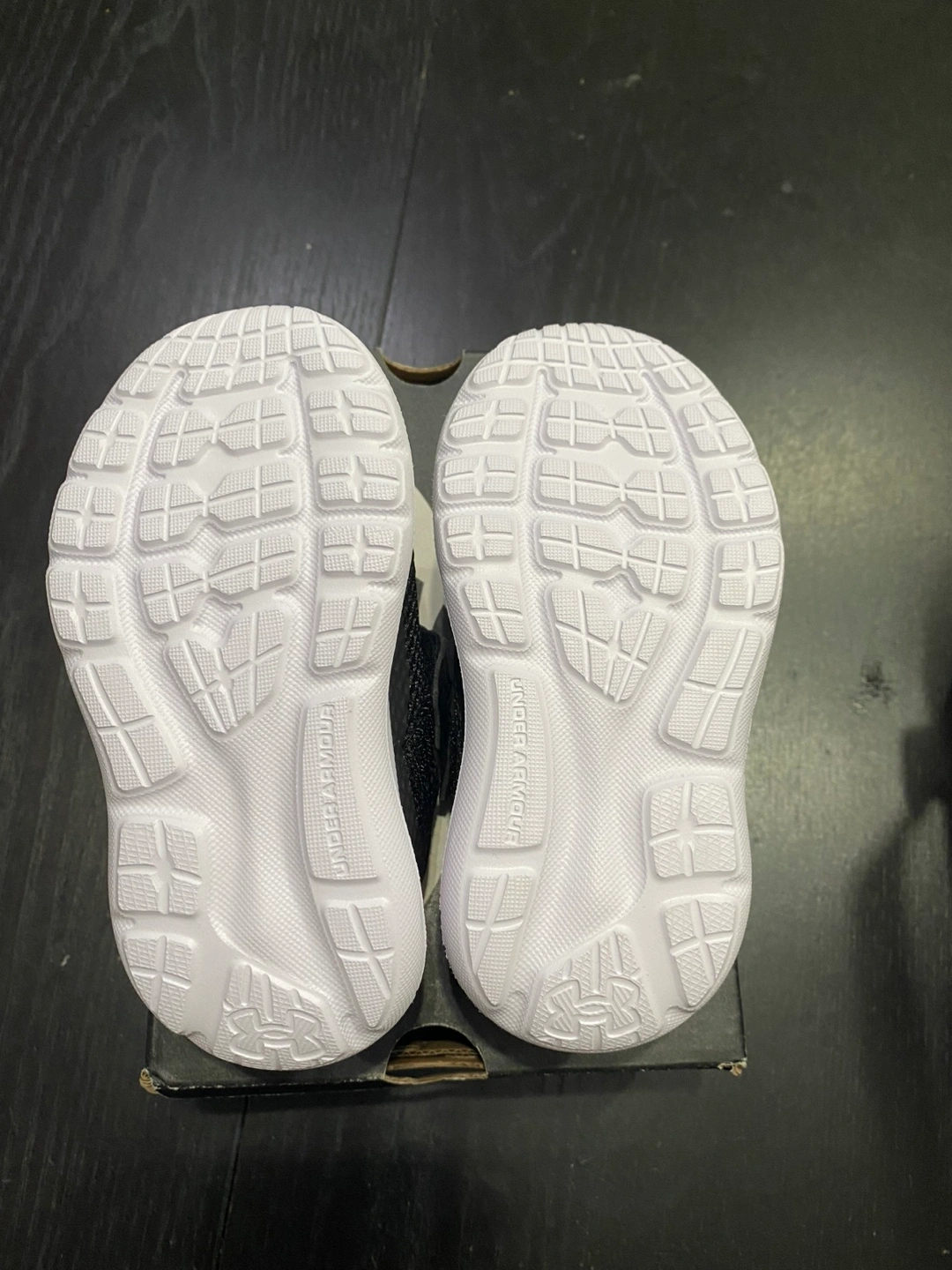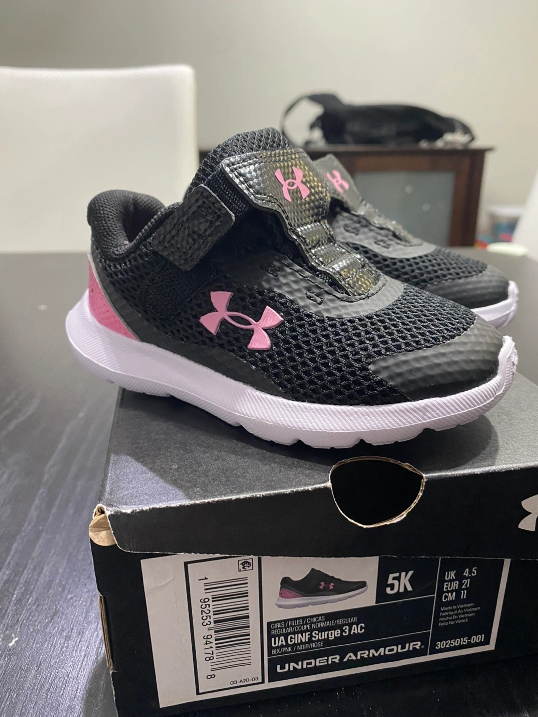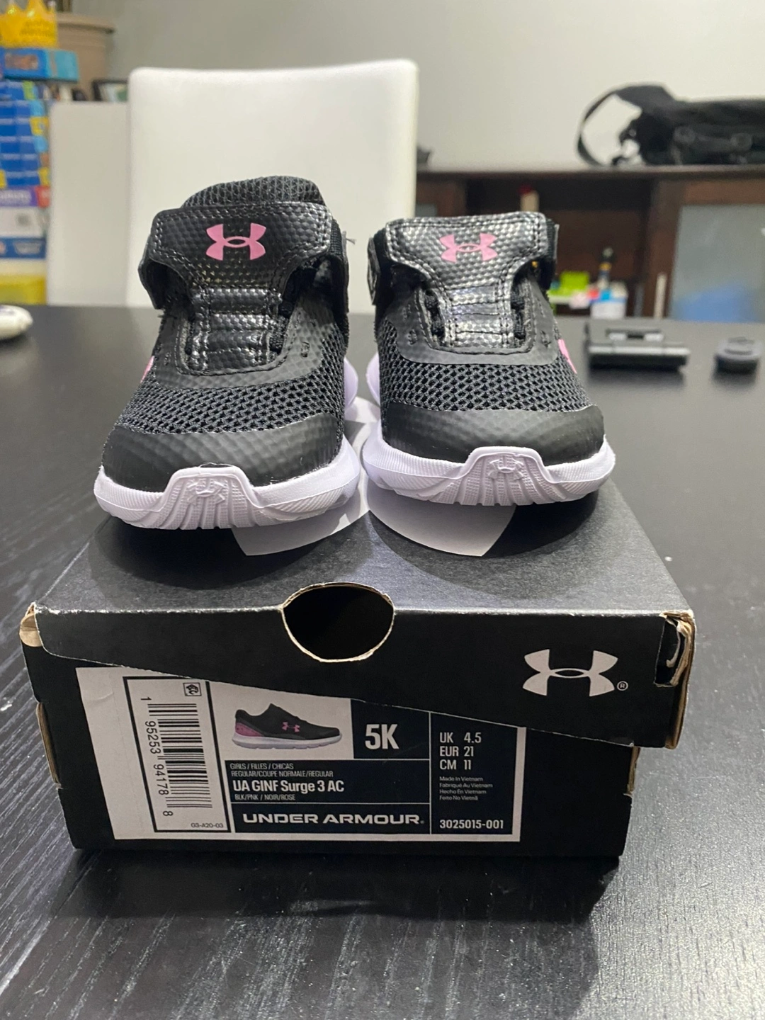 Selling a pair of Under Armour UA GINF Surge 3 AC kids shoes in size 5K. They're in great shape and come with the original box! The shoes are black with pink accents, perfect for your little one. The size is US 5K, UK 4.5, and EUR 21.