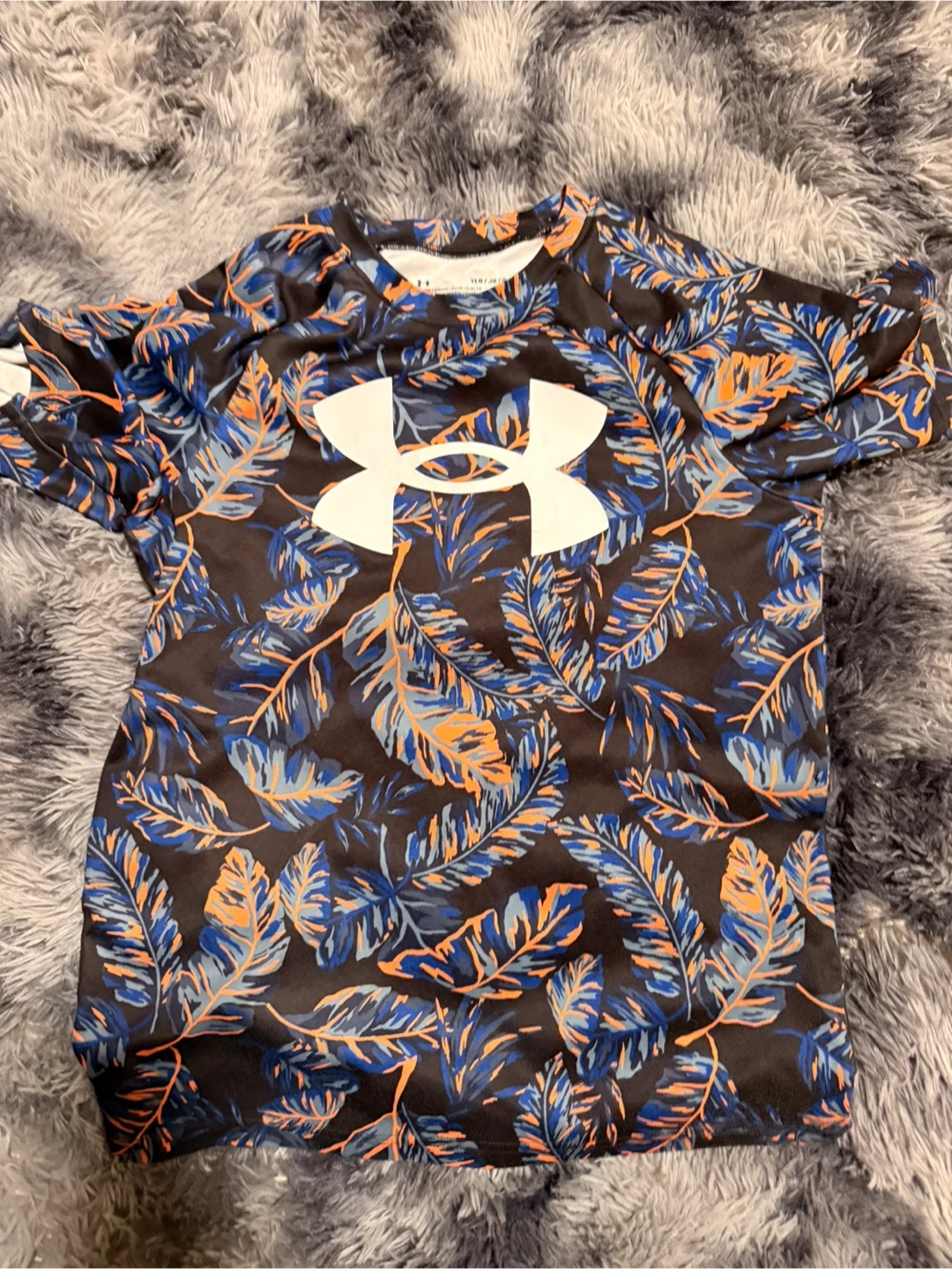 Youth Under Armour t-shirt with a cool leaf pattern! The shirt features the Under Armour logo on the front. Great for sports or everyday wear!