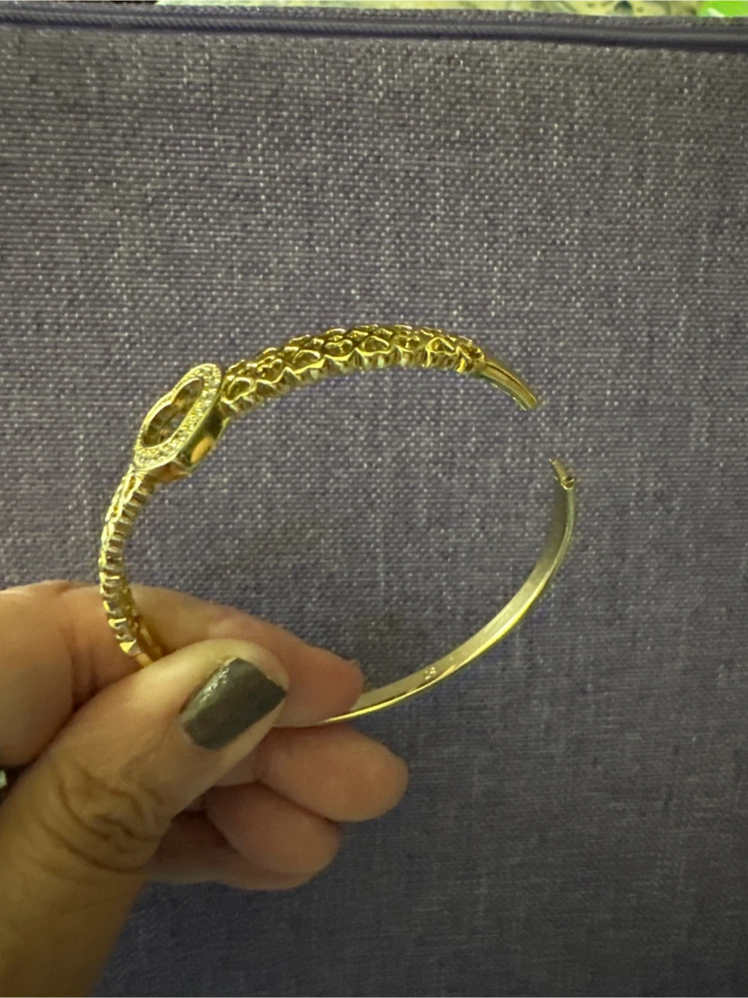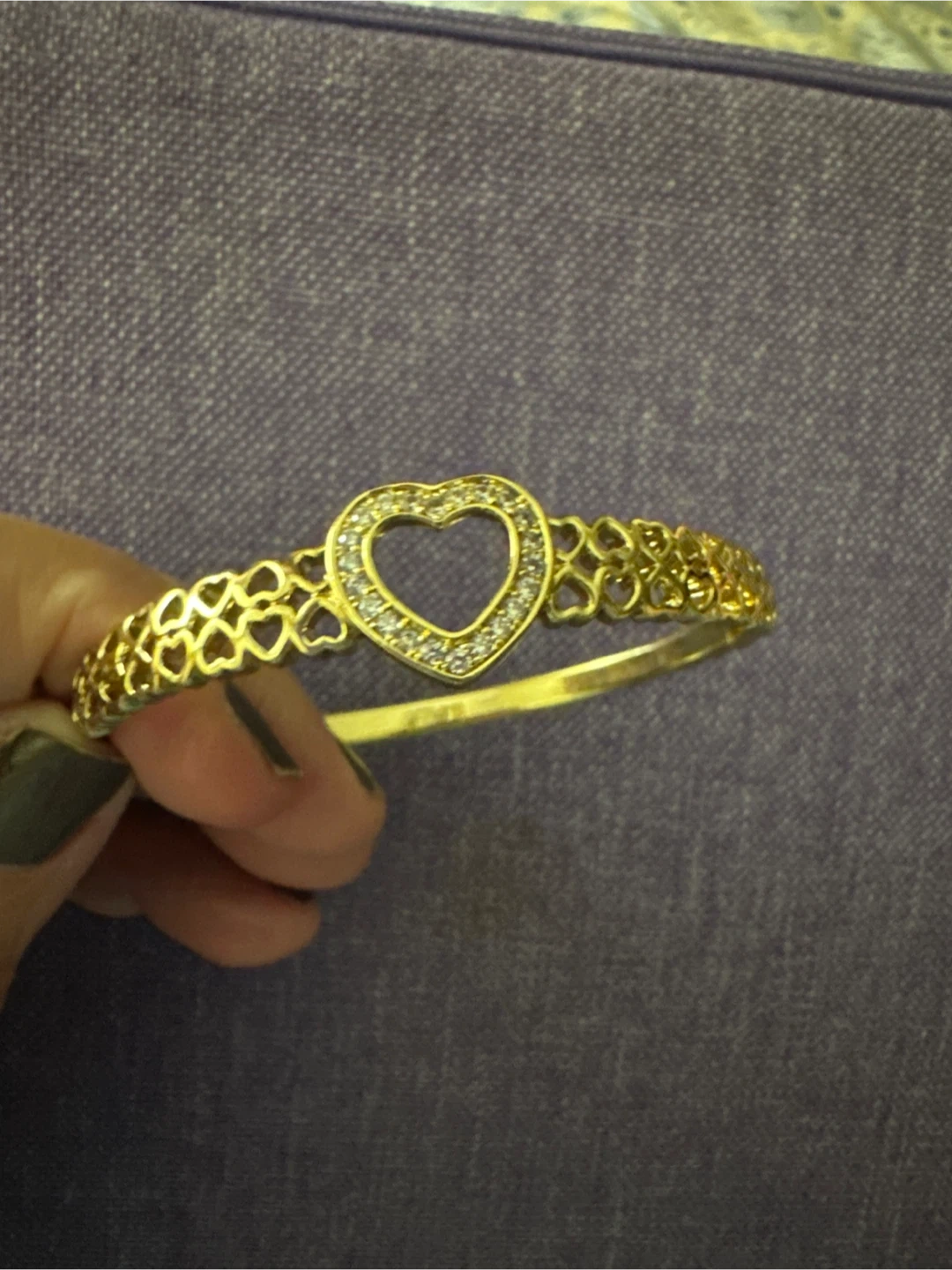 Gold-tone bracelet with a heart-shaped centerpiece encrusted with clear rhinestones. Intricate heart cutouts adorn the band. It's a beautiful accessory for everyday wear or special occasions!