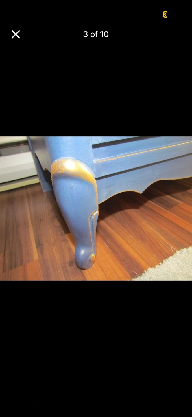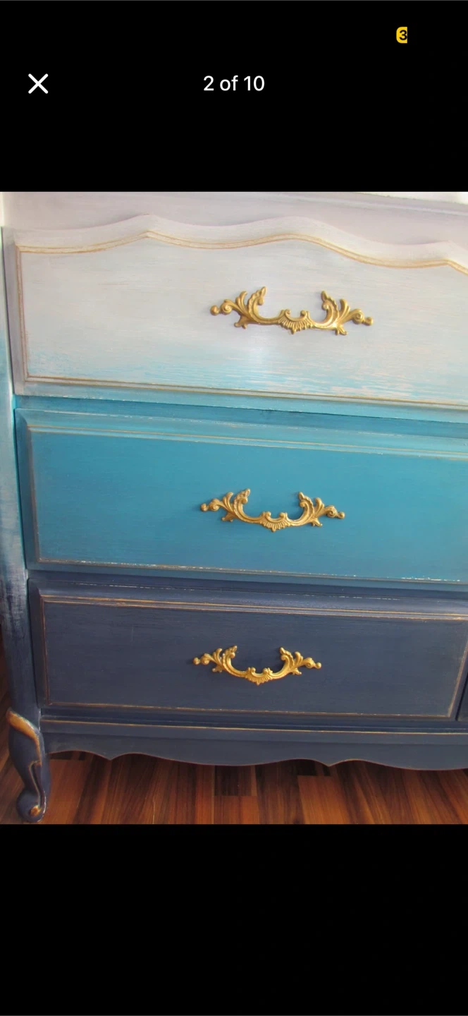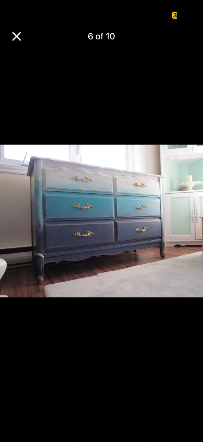 This dresser has been refinished with a beautiful ombre blue paint job and ornate gold hardware. It features six drawers with ample storage space. This piece would make a lovely addition to a bedroom or living area!