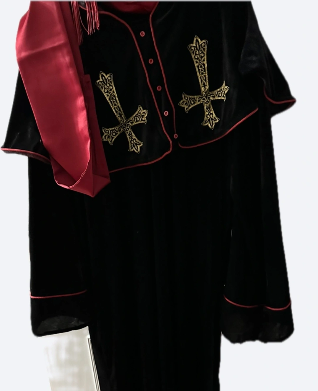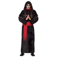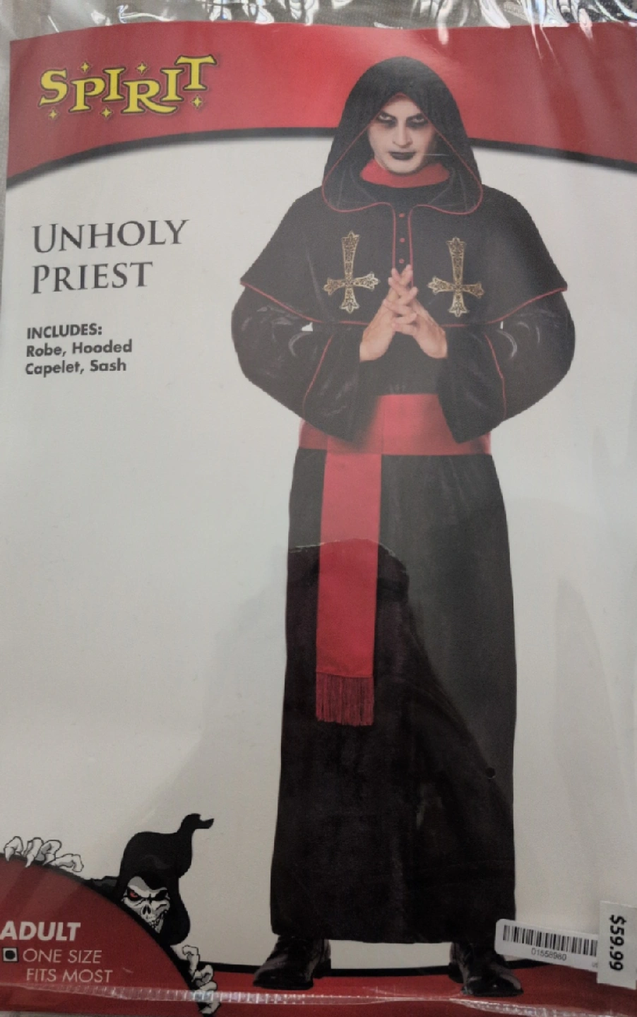 An adult one-sized unholy priest costume. Includes a hooded robe and a sash. A great item to wear while scaring your friends this Halloween. I have modified the sash for my husband’s belly to fit! I had to resize it so there are stitches originally bought 60 $ He wore once and briefly