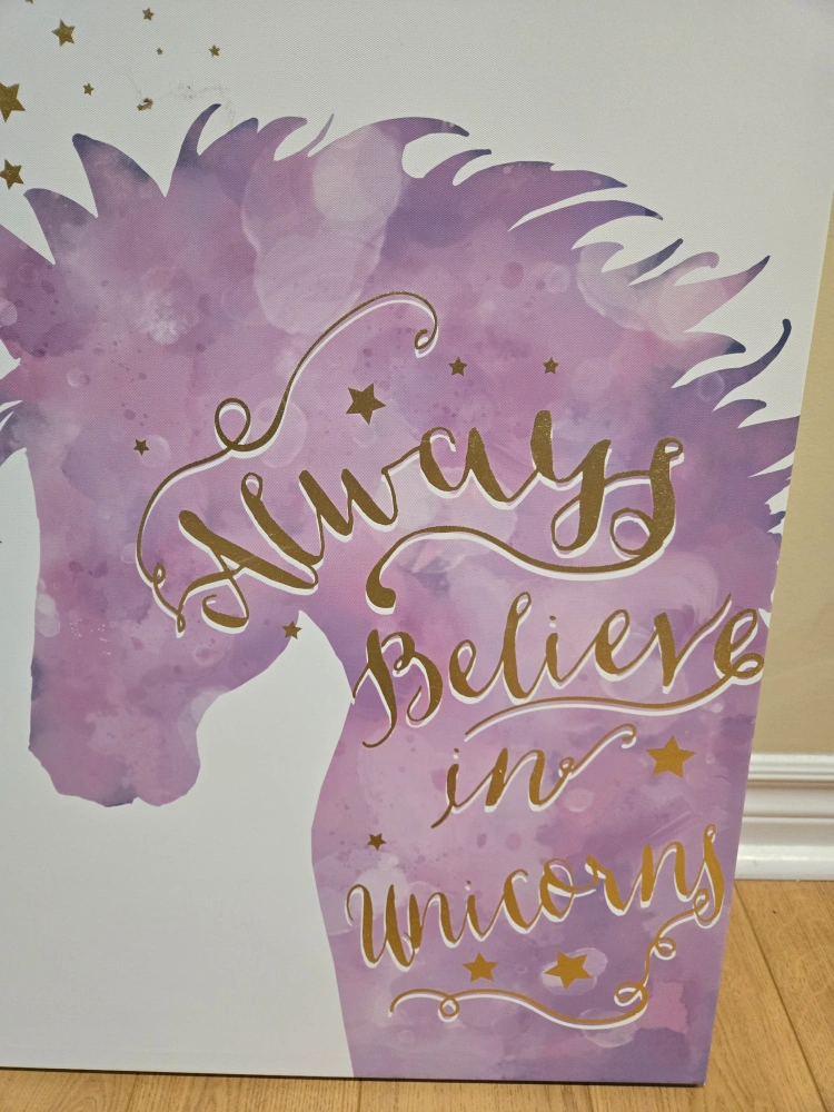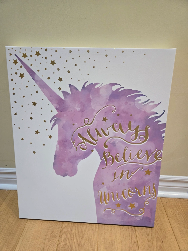 Cute canvas wall art featuring a unicorn design with the words 'Always Believe in Unicorns' in gold lettering. Perfect for a kid's room or nursery!