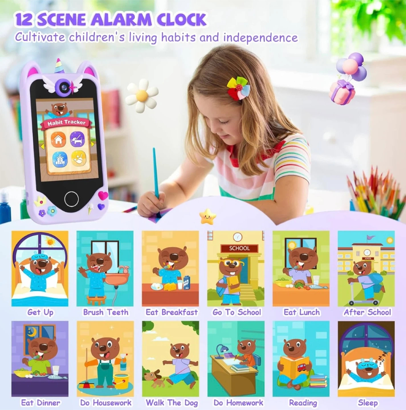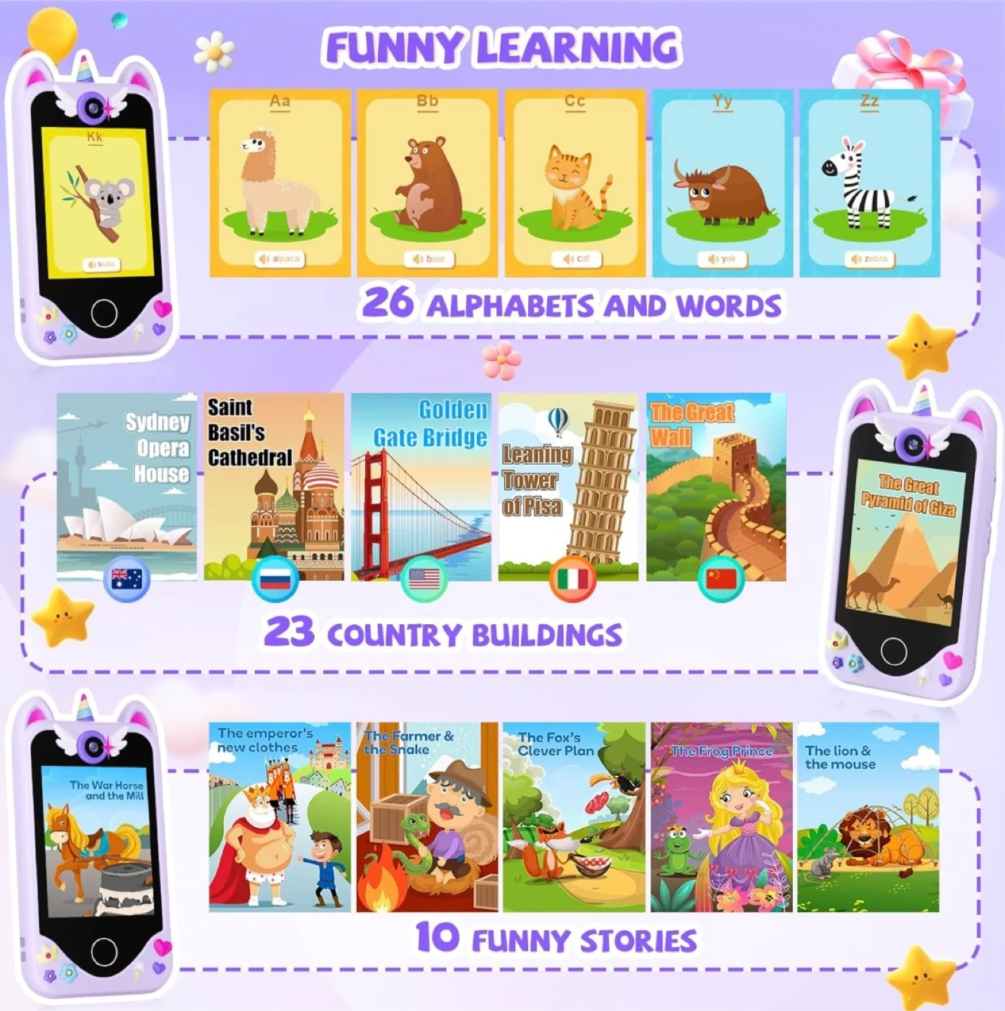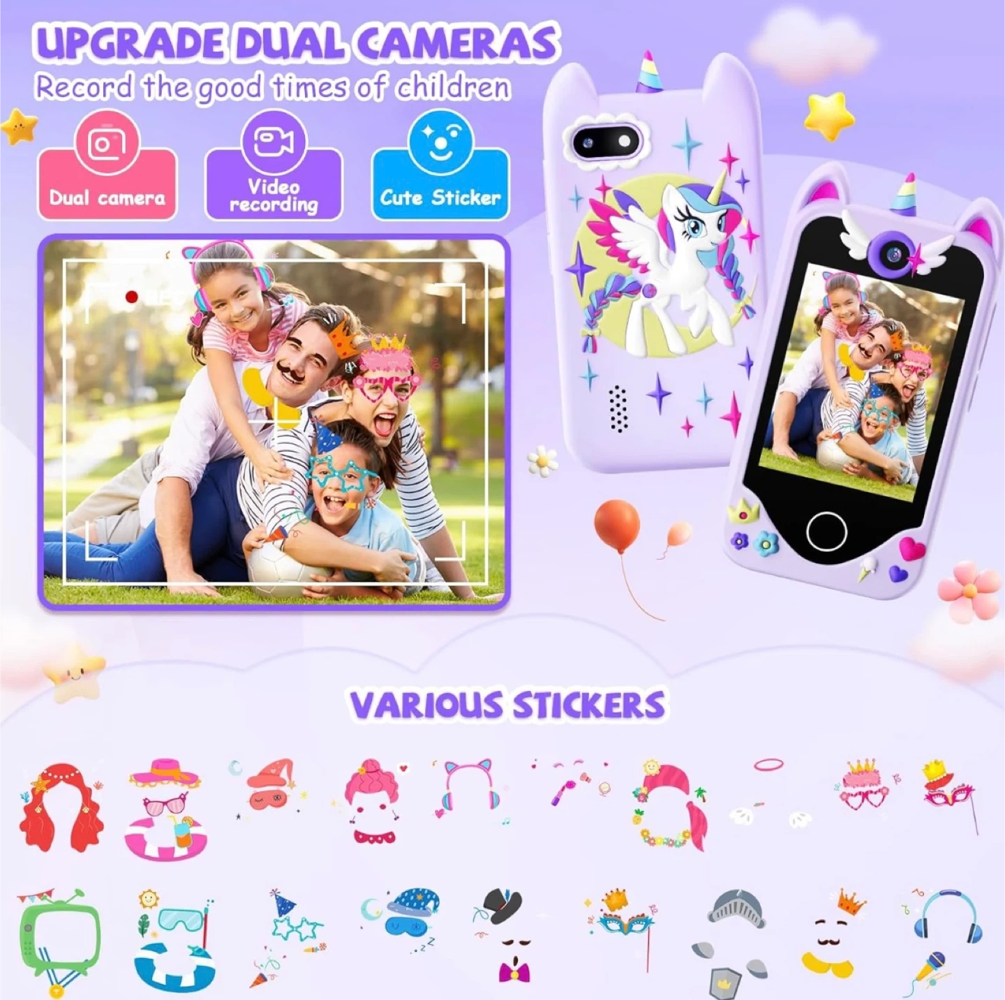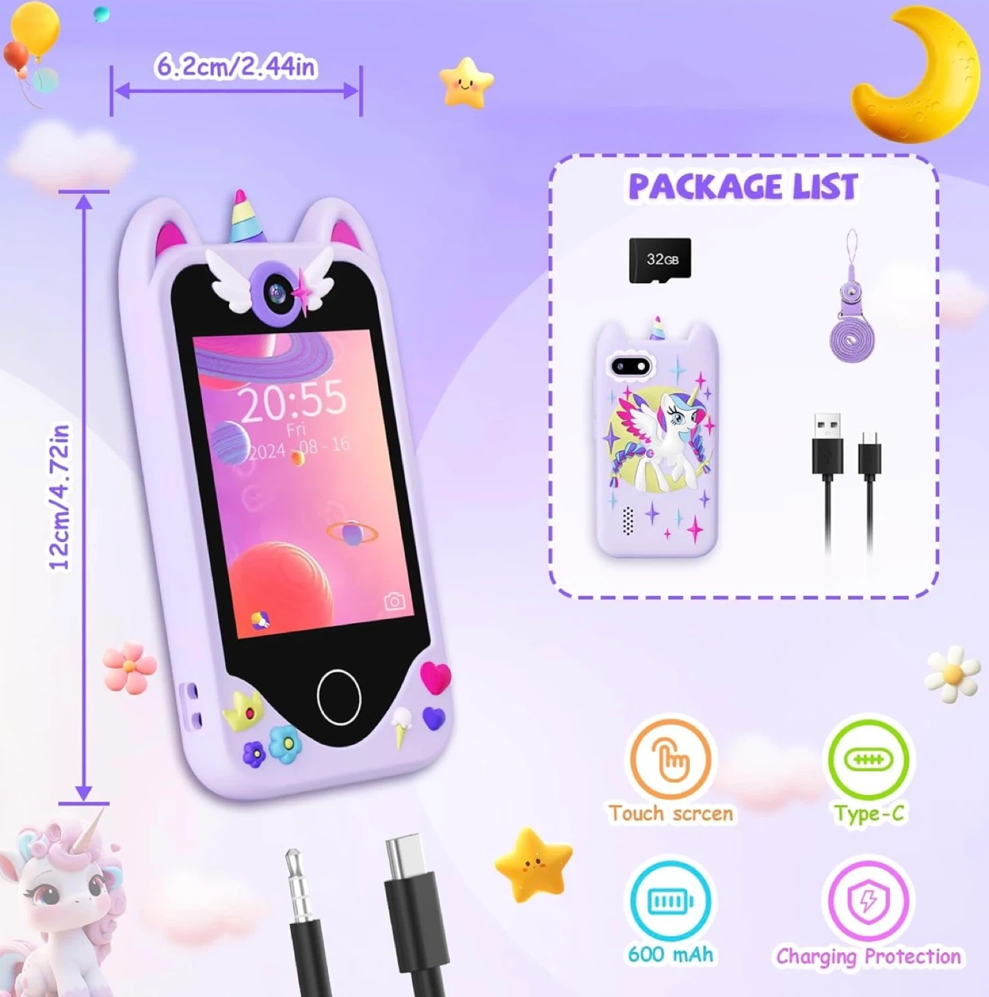 This is a cute purple unicorn kids smart phone! It has dual cameras for taking photos and videos. It also has learning games and stories. It comes with a 32GB SD card. Great for learning habits and independence! Pick up in UES