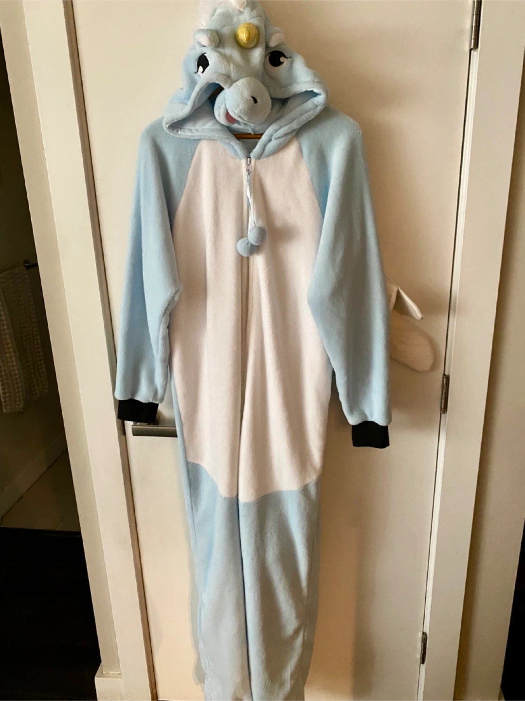 1000+Super cute clean unicorn onesie! It's a light blue and white colour, and it's made of a soft, plush material. Perfect for cozy nights in or a fun Halloween party 🎃