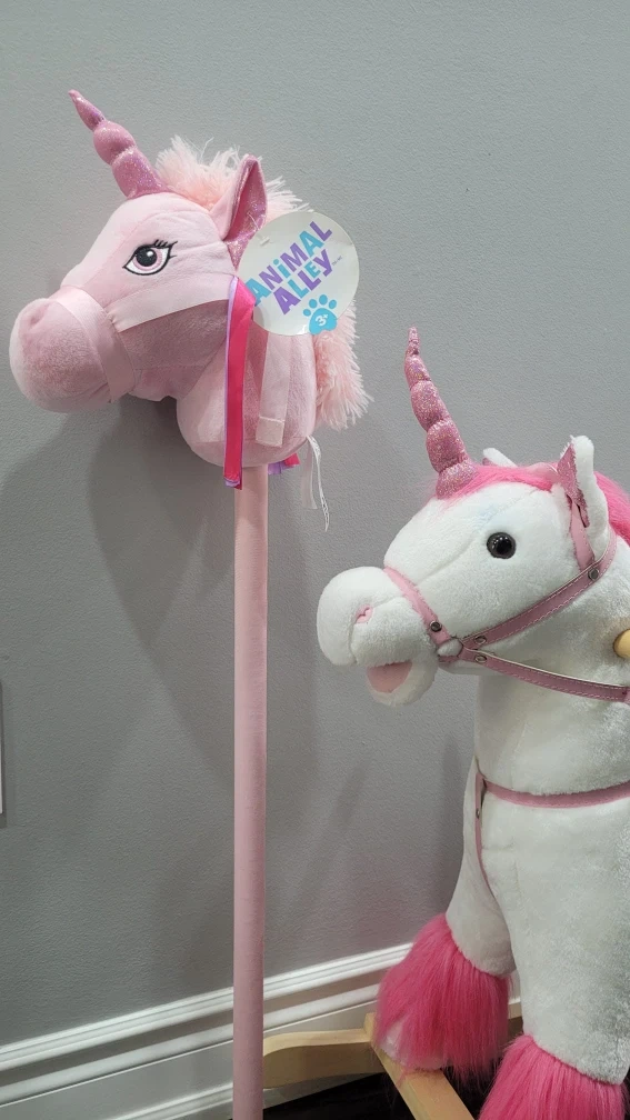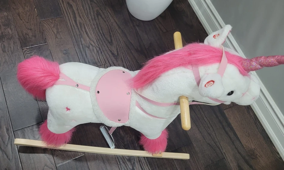1034" Stick Unicorn ride for imaginative adventure. Comes with electronic sounds for Role Play fun. Helps with early Learning Development, Nurturing and Sensory touch. Suitable for children ages 3 years and up. Unicorn Plush Rocking Horse. Handcrafted plush kids' rocking toy for kids features a sturdy and curved wooden base that create a smooth forward and back rocking action for hours of fun. Soft and comfortable riding saddle area. Improves the muscle strength, balancing skills, and coordination. Equiped with electronic neighing and galloping sounds on pressing ears. Suitable for children ages 3 years and up.