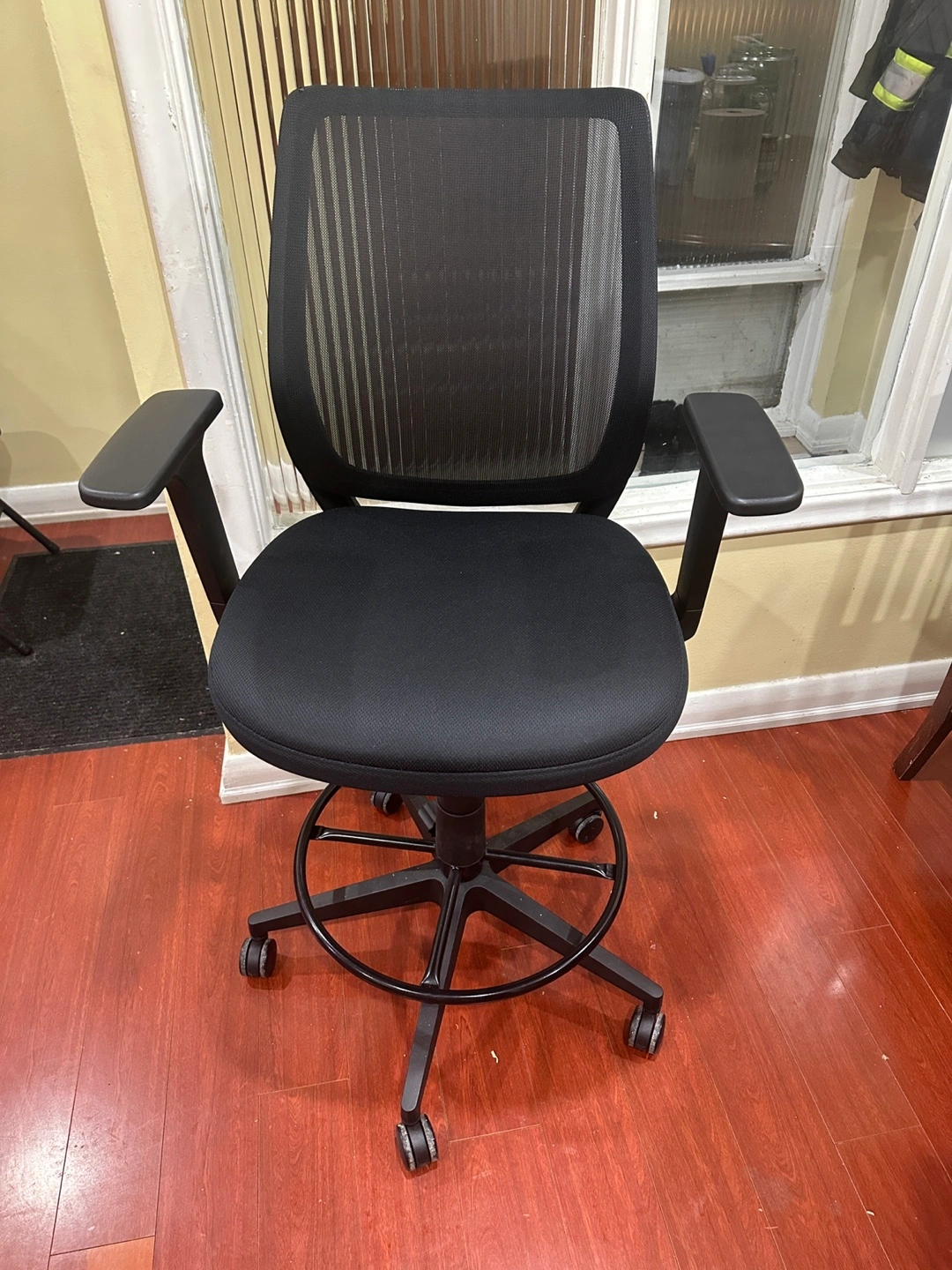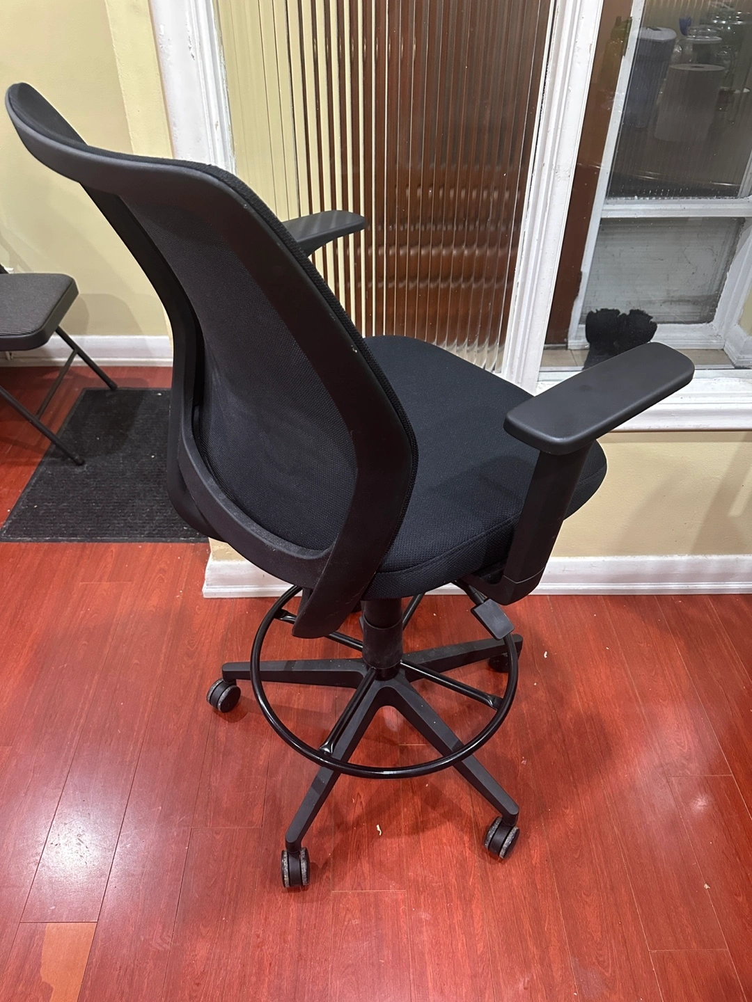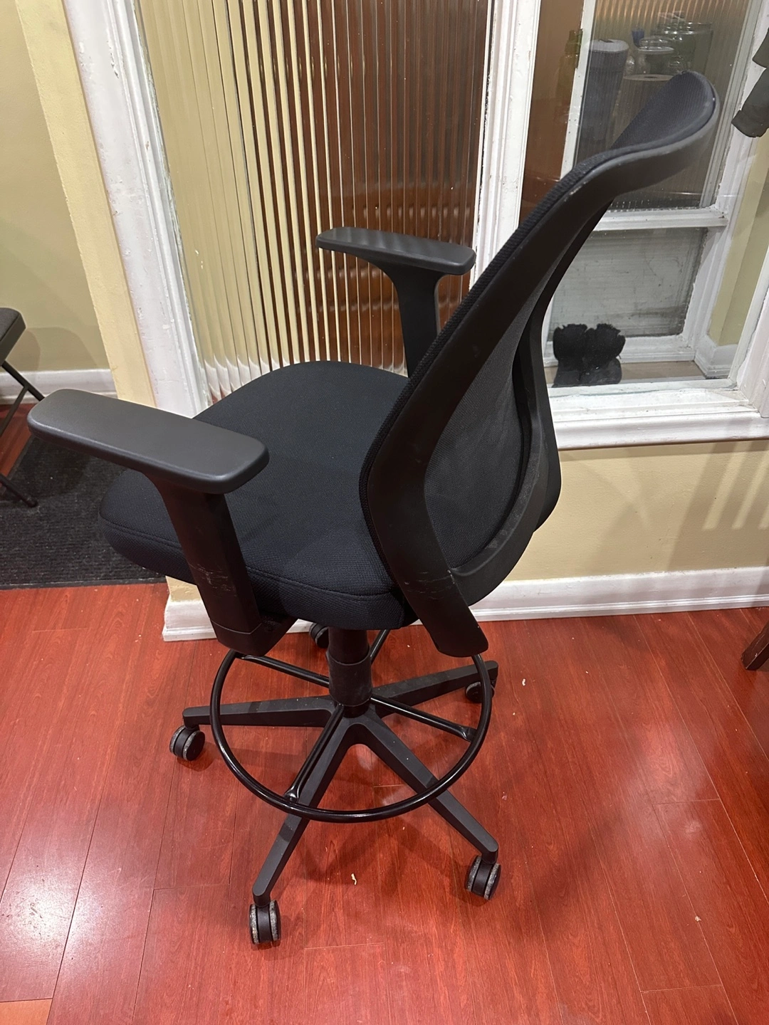 18Black drafting chair. Mesh back and fabric seat. Adjustable height. Five-star base with casters. Armrests.