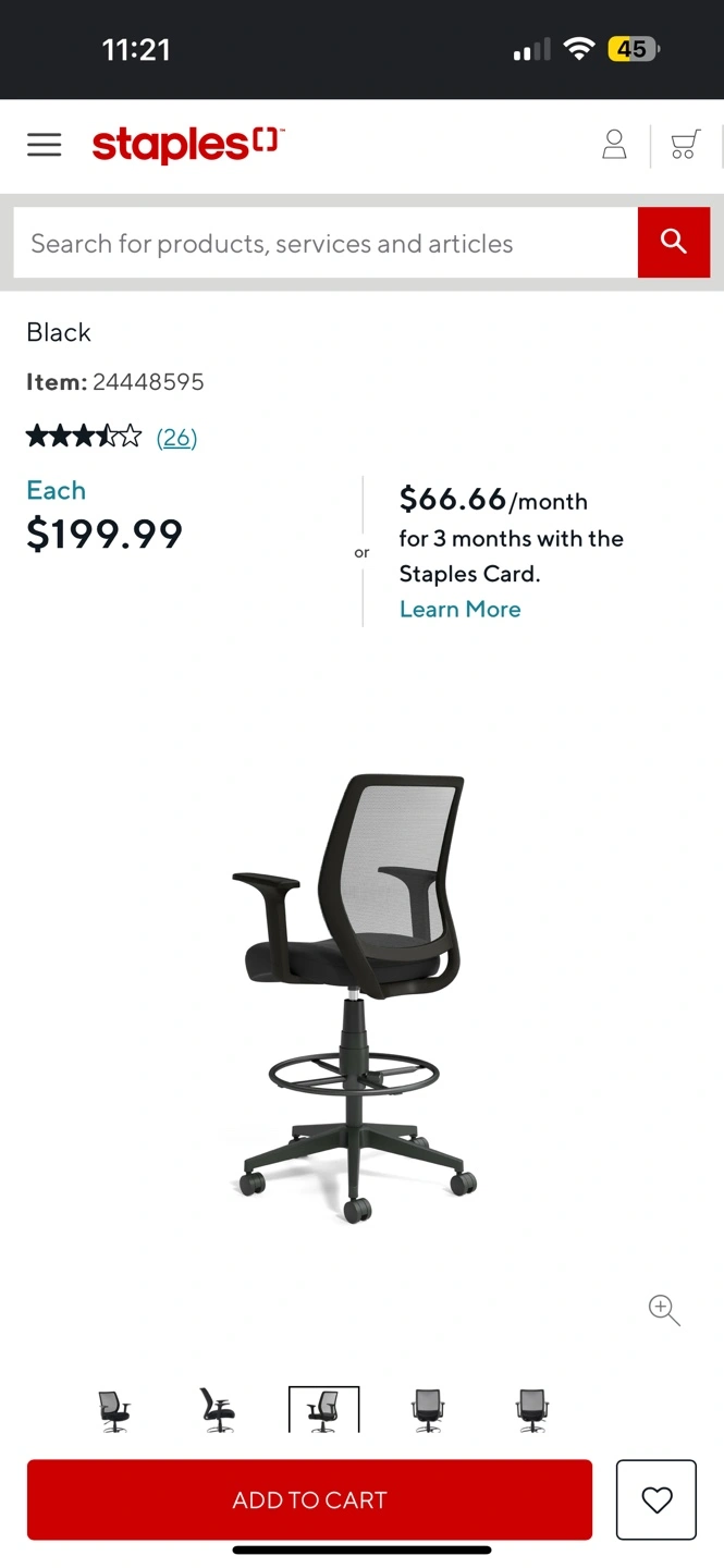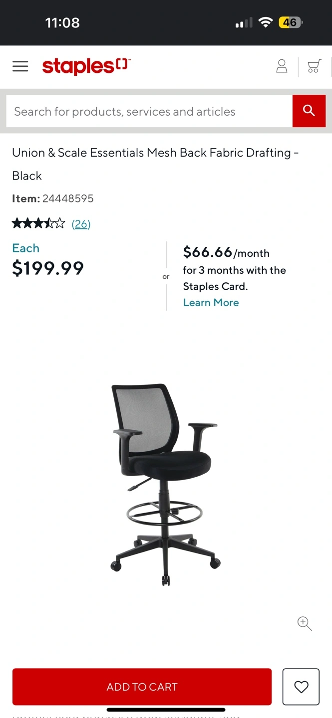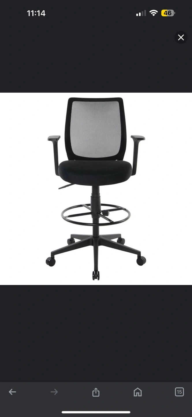 18Black drafting chair. Mesh back and fabric seat. Adjustable height. Five-star base with casters. Armrests.