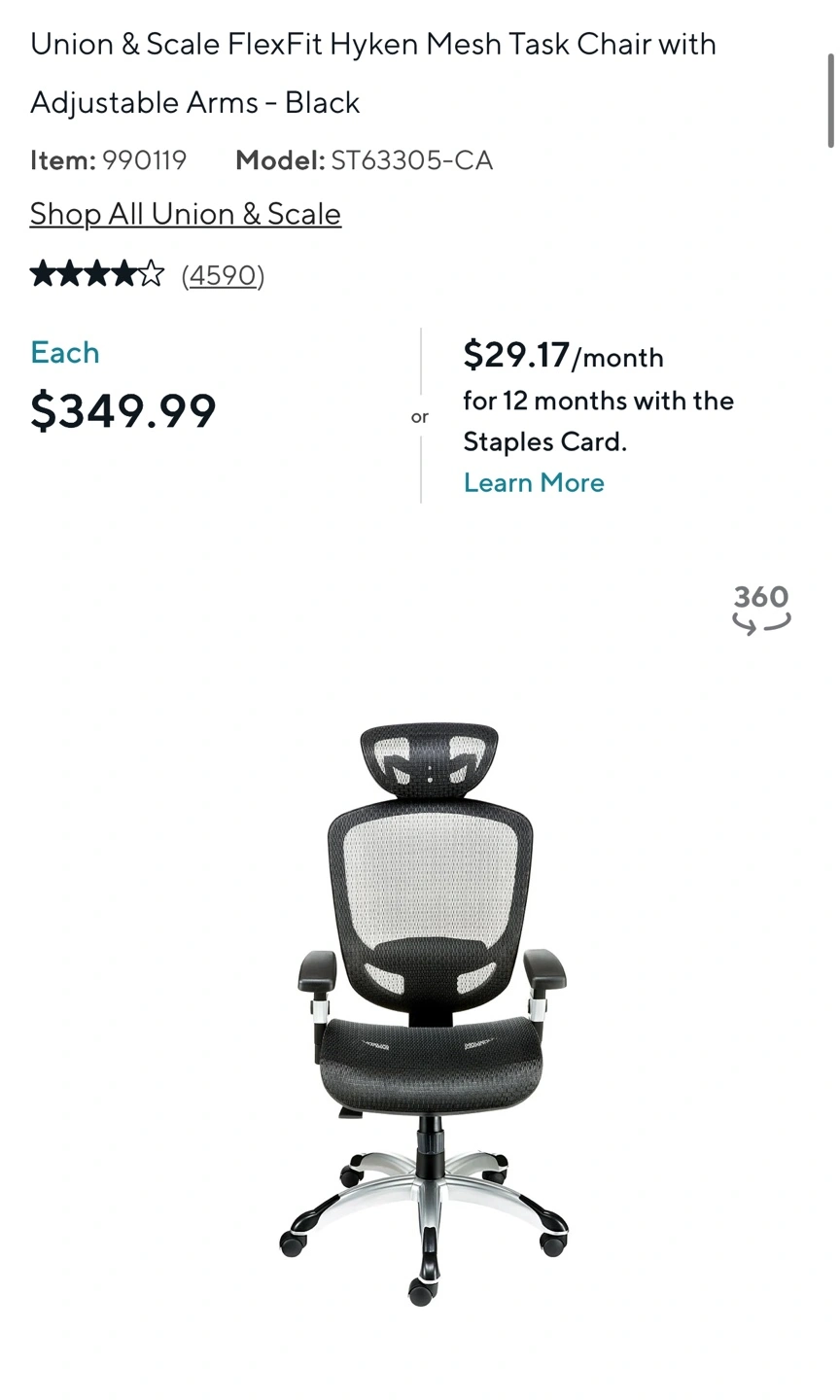 87Looking to sell my Union & Scale FlexFit Hyken Mesh Task Chair in black! It's in great shape and ready for a new home. - Adjustable Arms - Model: ST63305-CA - Originally bought for $349.99 It's super comfy and perfect for working from home, good condition