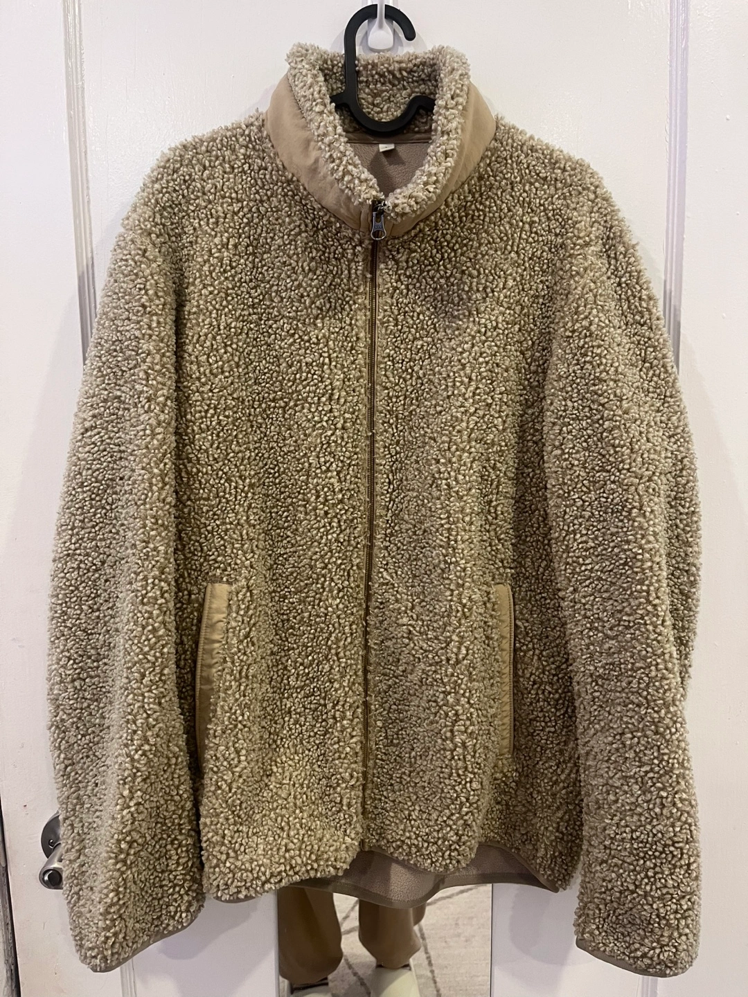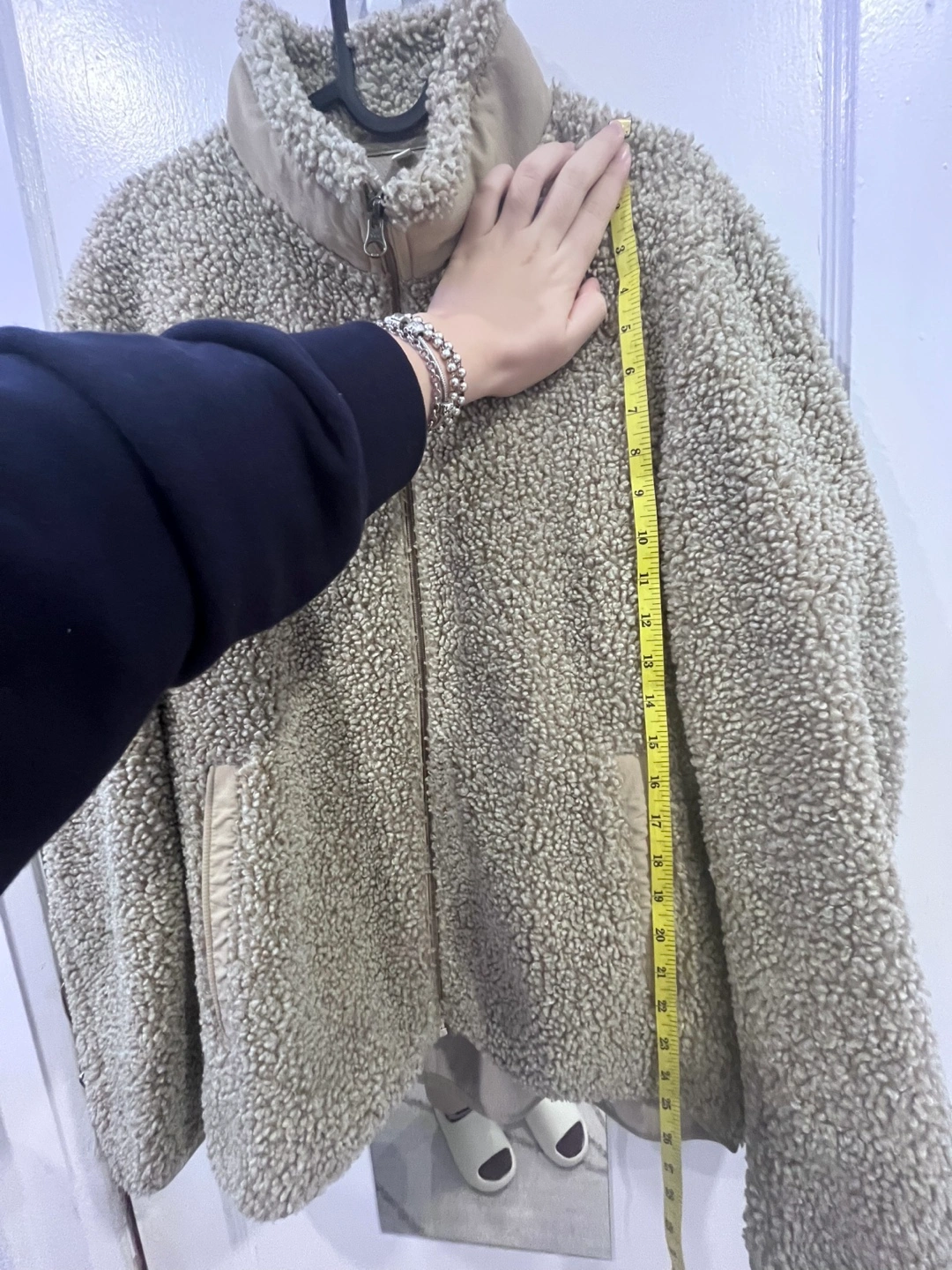 202Soft, fuzzy jacket with a zipper closure. Has two front pockets.