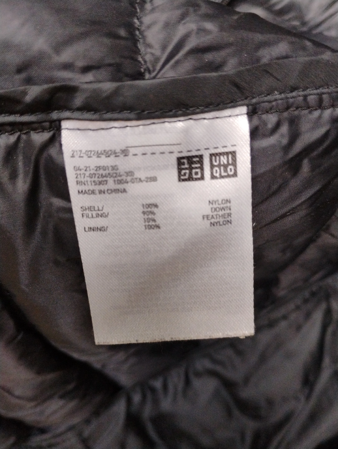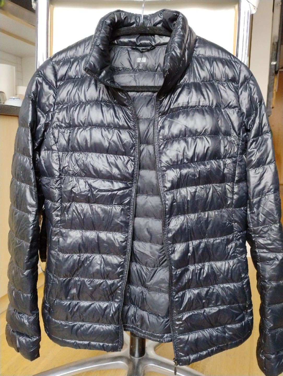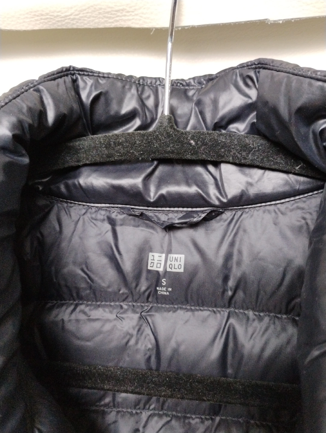 53Selling a gently used Uniqlo down jacket in black, size small. It's made with a nylon shell and lining, and filled with 90% down and 10% feather. Perfect for layering or wearing on its own during cooler weather!