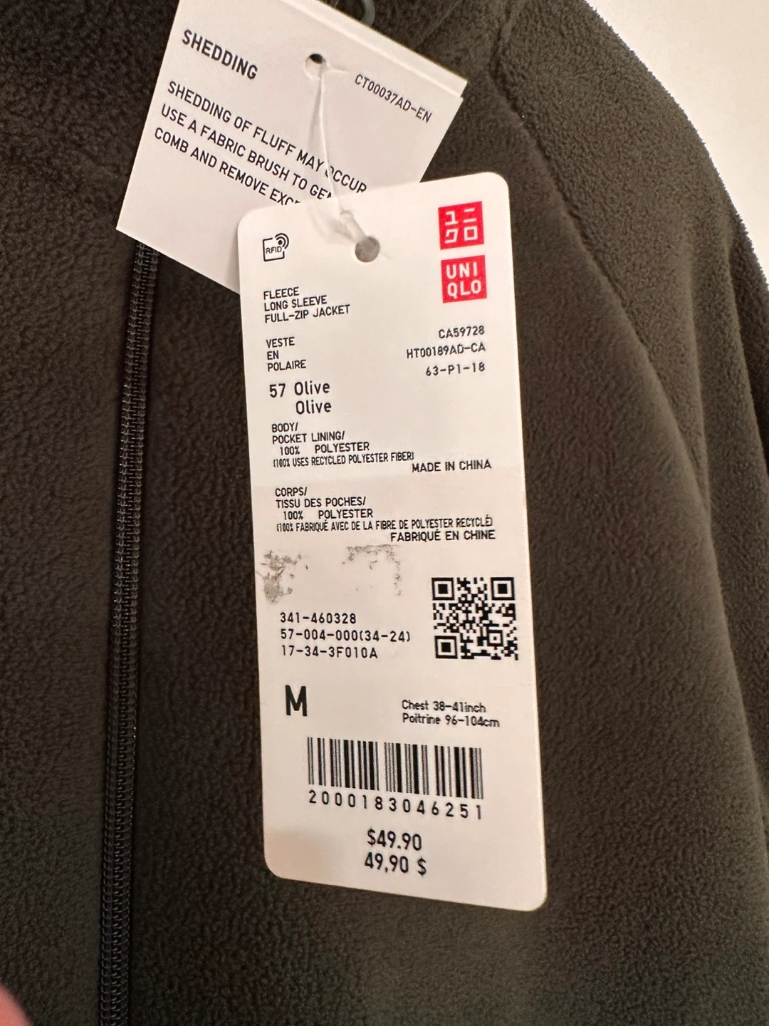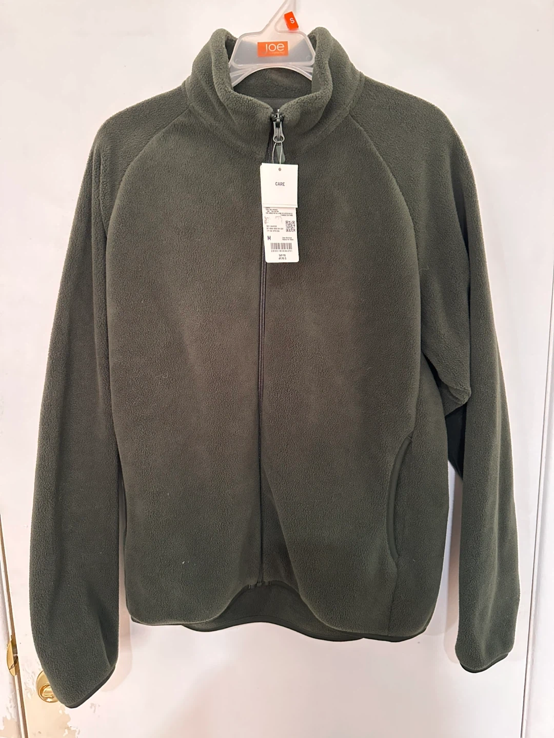 Cozy up with this Uniqlo fleece jacket! It's a long-sleeve, full-zip style in a lovely olive colour. Size is M, and it's made with 100% recycled polyester fibre. Originally bought for $49.90