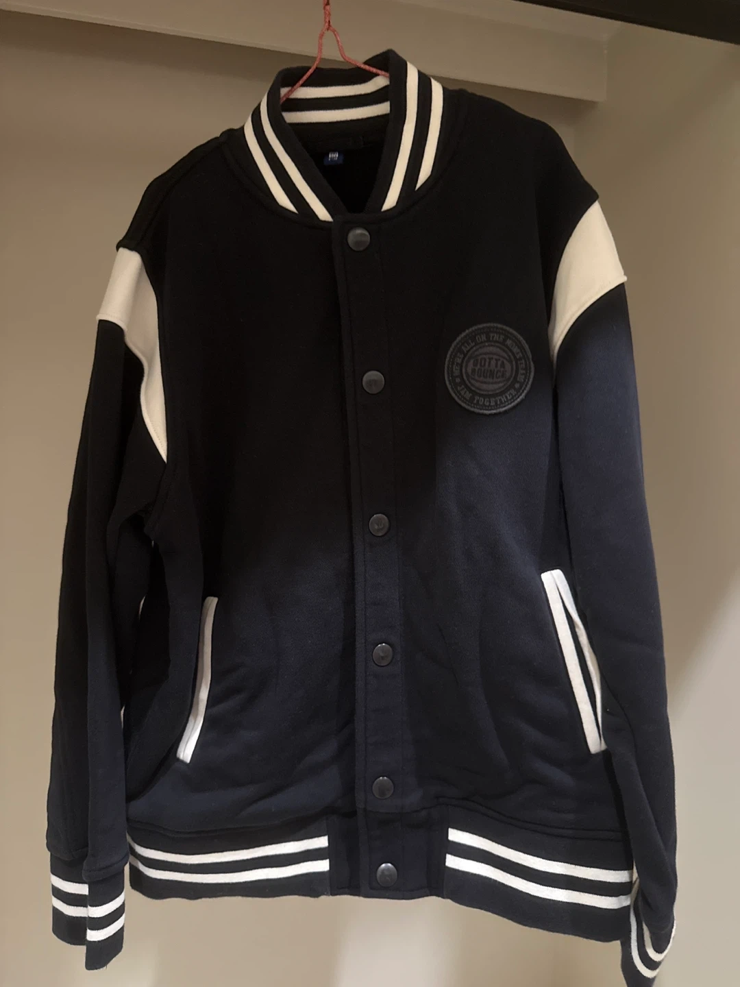60Selling a Uniqlo kids' varsity jacket in great condition! It's a stylish navy blue colour with white accents on the collar, cuffs, and hem. Perfect for keeping your little one warm and looking cool. Size is 9-10.