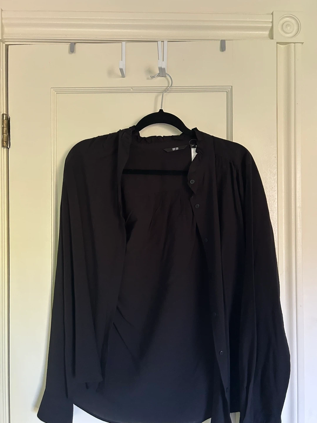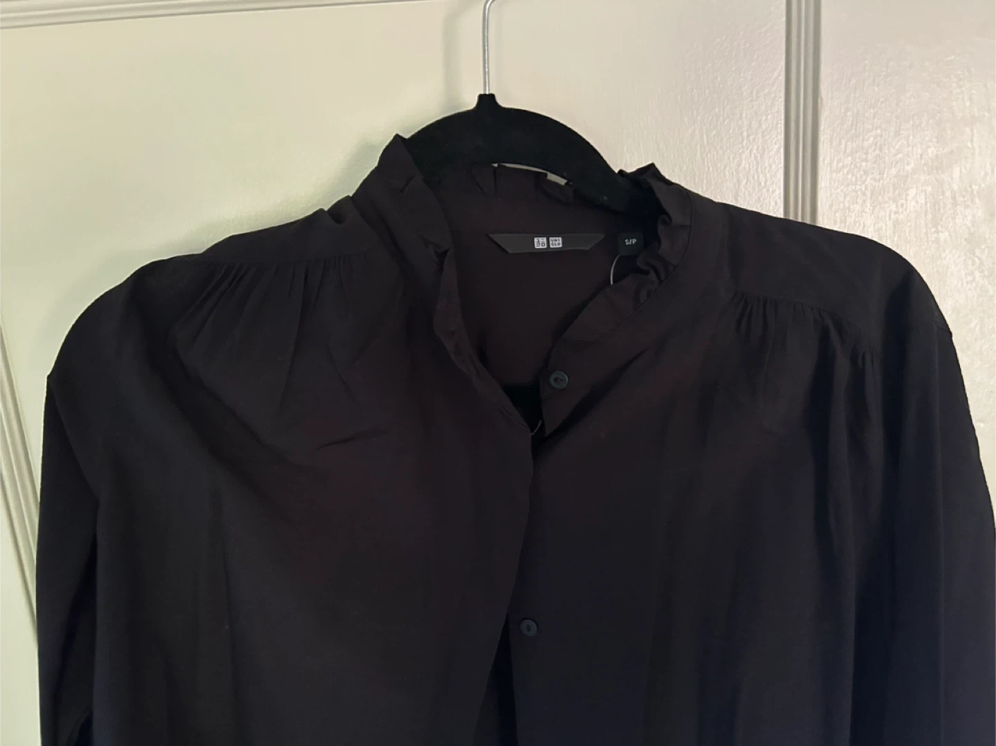 Selling a Uniqlo ruffled long sleeve blouse in black! It's a size small and in great condition. Originally bought for $49.90