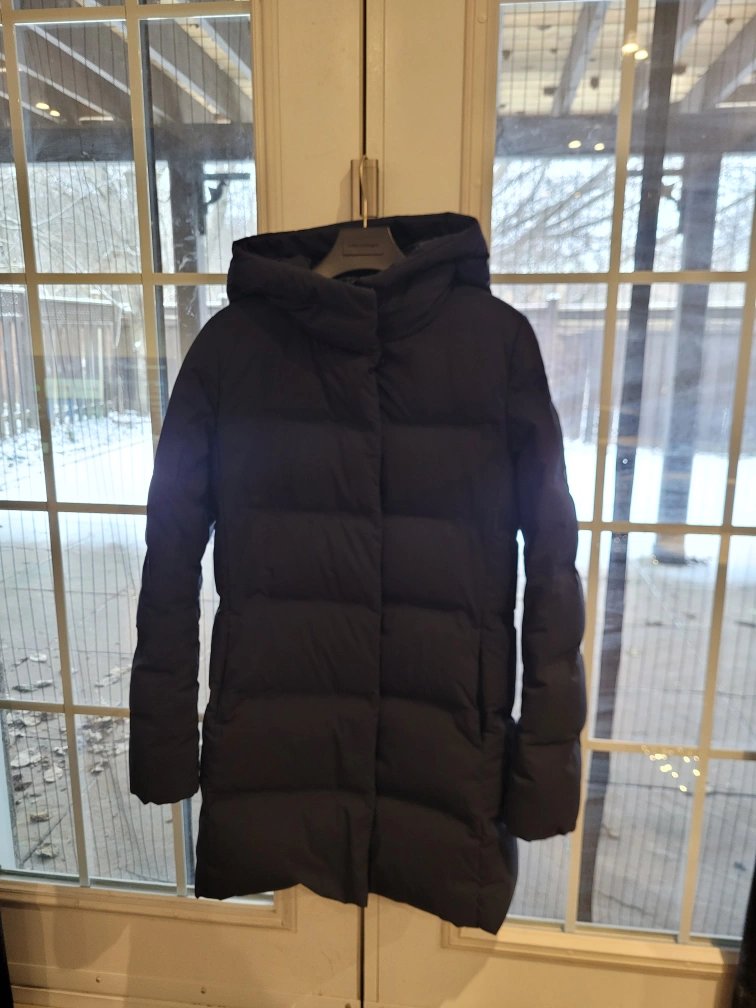 Navy puffer jacket with hood, size XS. Lightweight, windproof, and water repellent.