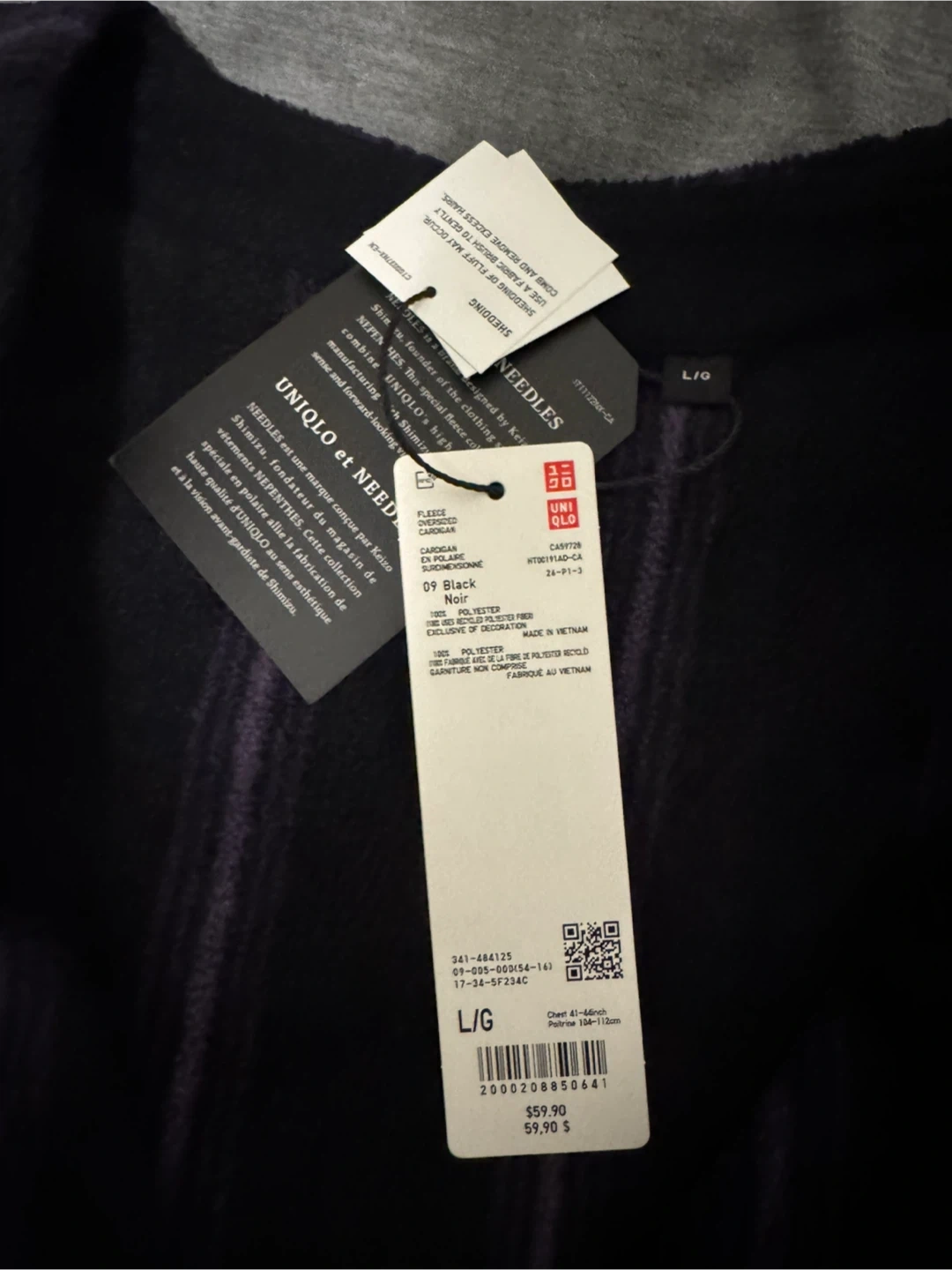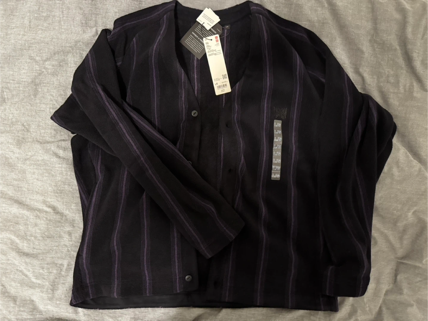 86Selling a Uniqlo x Needles cardigan in black, size L. It's in great condition and features a unique design. The cardigan is made from 100% polyester and recycled polyester fibre. It retails for $59.90.