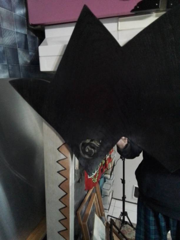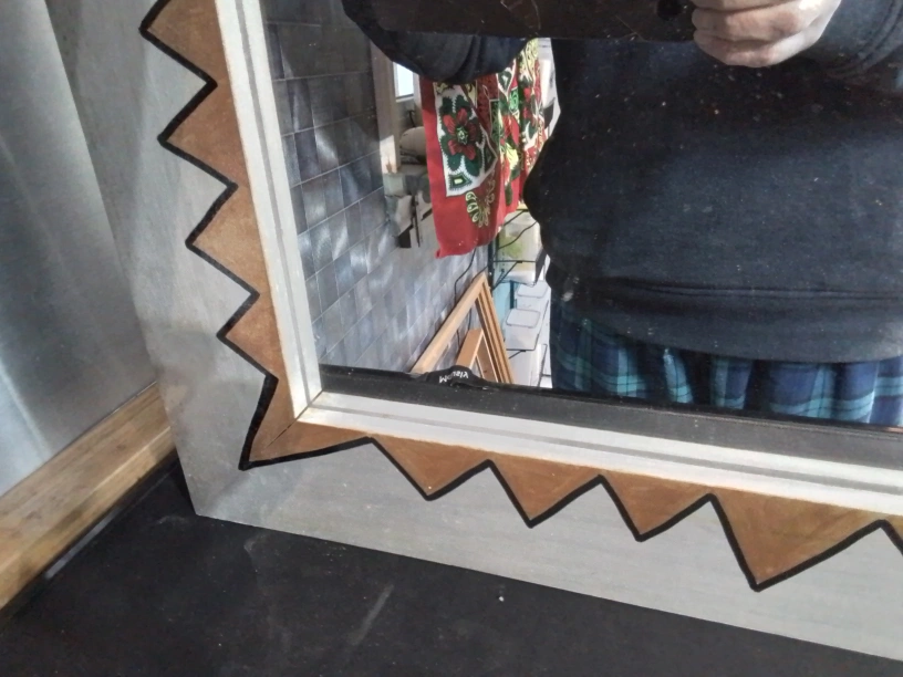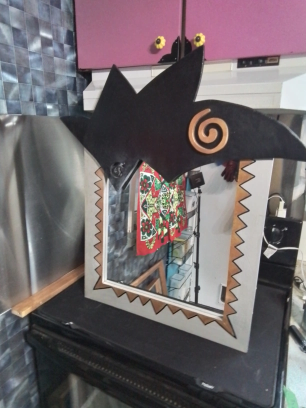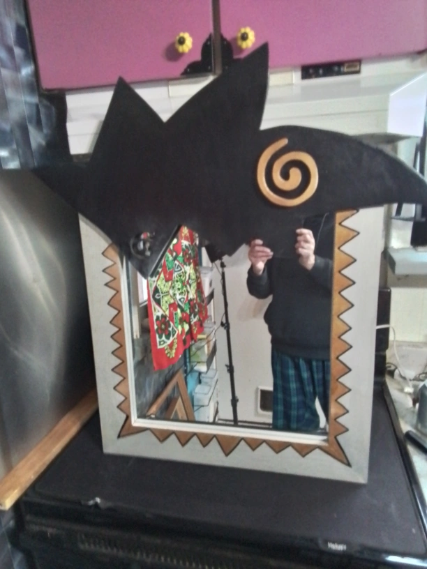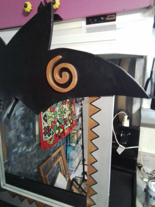 114Unique Artistic Wall Mirror Large framed mirror. Features a striking black and gold design. Intricate wooden accents. Adds character to any room. Measurements 31X24: very good condition Pickup at Young Street and Steels Ave