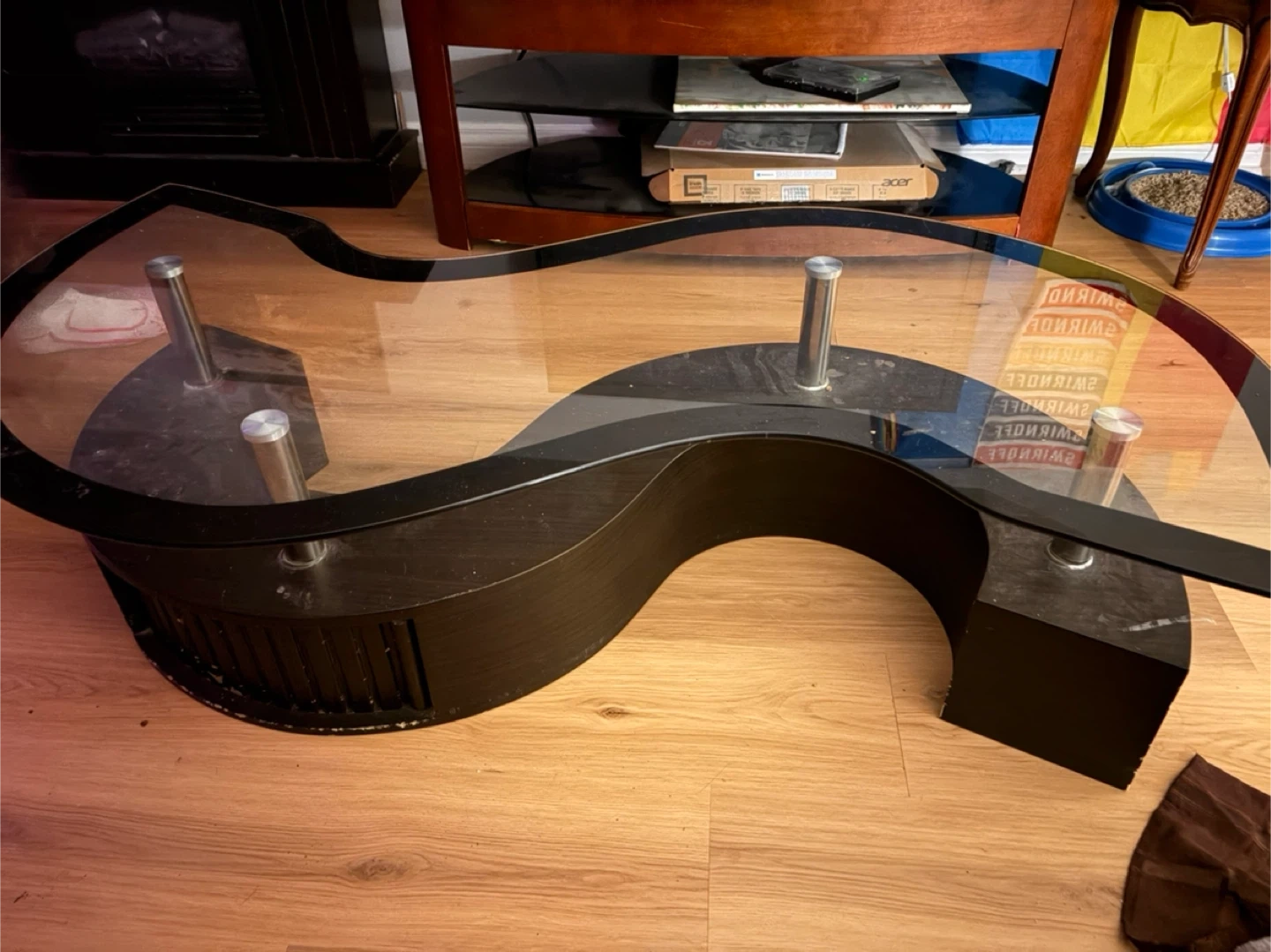 87Selling a unique coffee table with a black base and a glass top. It has a very distinct shape that will definitely add character to your living room. It's in decent condition there are sliding doors and underneath can be used as space have a few bumps along the doors but it’s a neat little table