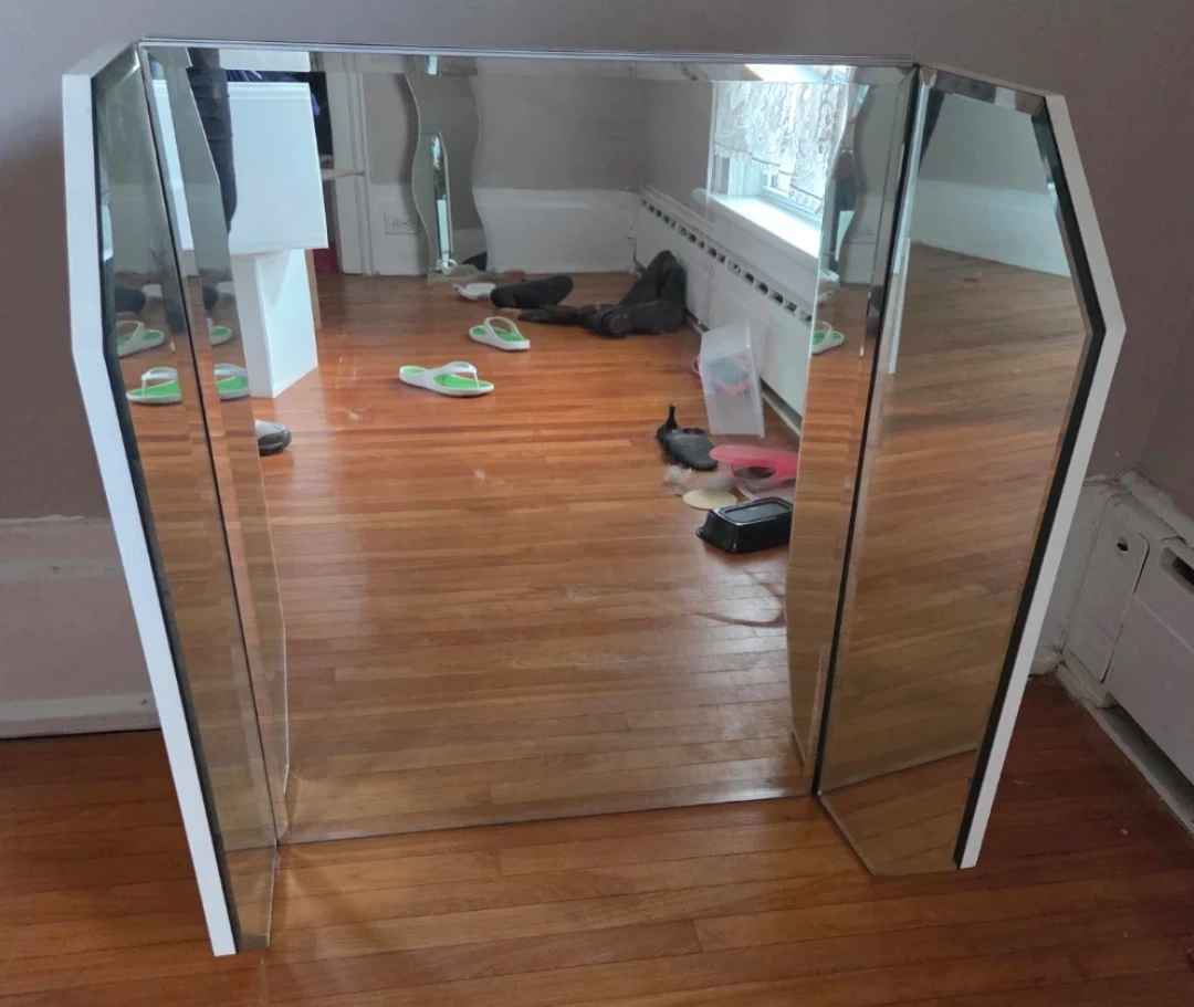 94Selling a unique decorative mirror! It has a cool, geometric design with mirrored side panels and a white backing. It would make a great statement piece for any room in your home. The main mirror needs to be re-glued to base. High quality mirror. Have wall hanger.