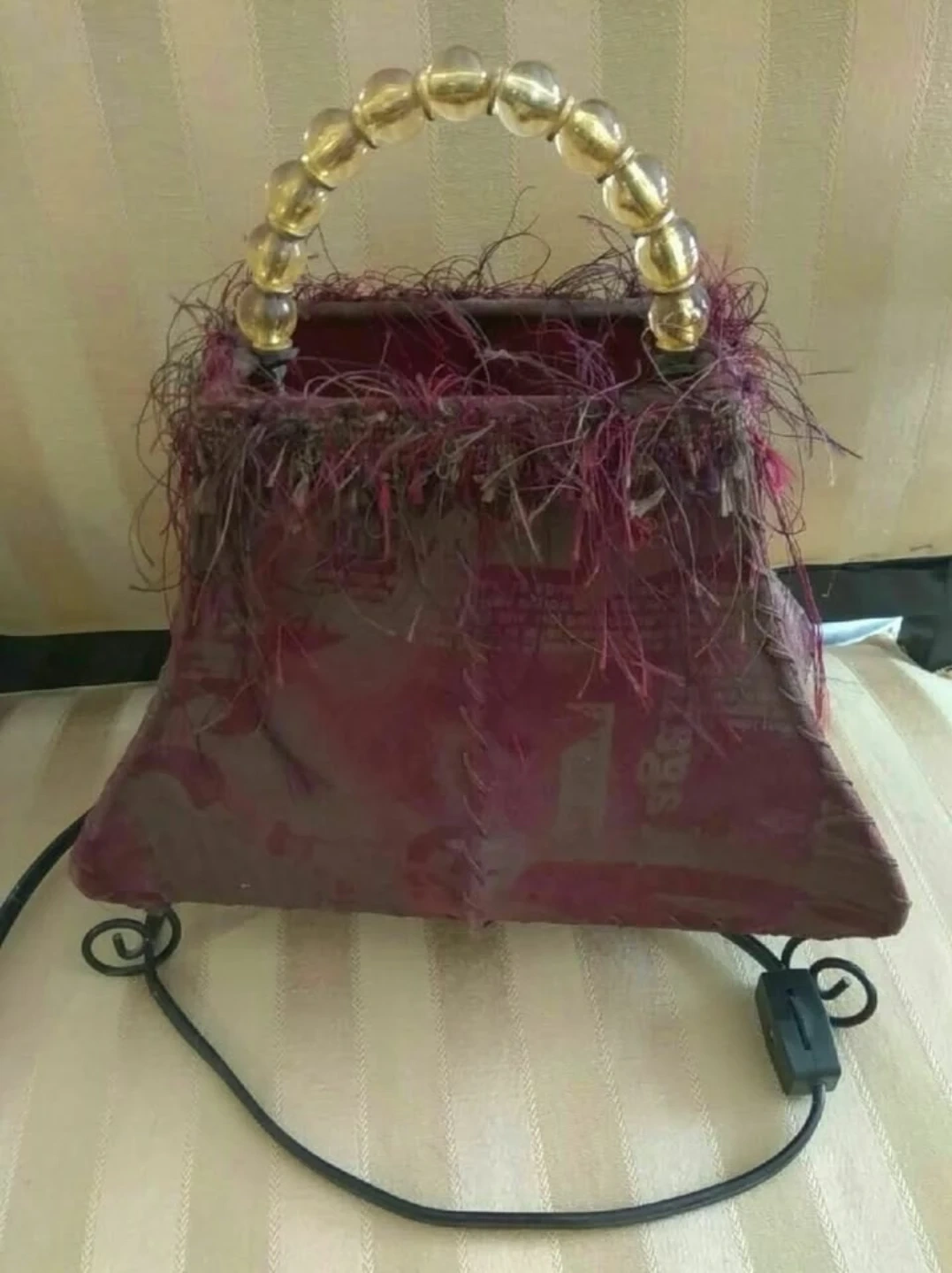 Burgundy lampshade, beaded handle, frayed trim. Features a dark cord and inline switch. Small, stylish table lamp.