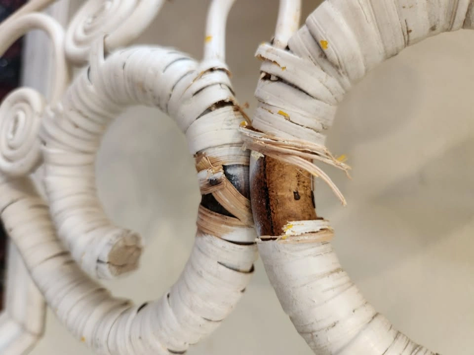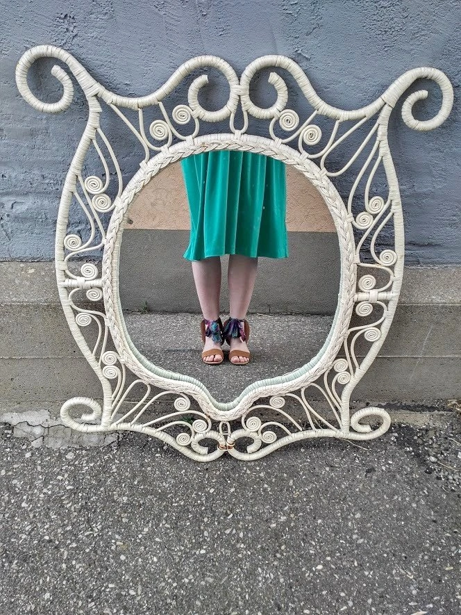 This oval-shaped mirror brings a touch of whimsical bohemia to any interior. Painted white natural rattan and cane are wrapped and intricately coiled for a gentle filigree effect. Measures 32 inch wide by 34 inch height. Please note there is some rattan wrap missing at bottom (2nd photo in listing).
