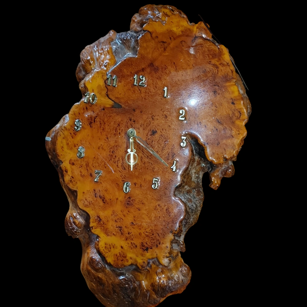 Selling a one-of-a-kind wooden wall clock. It has a very unique shape and design with visible wood grain. The numbers are metallic and easy to read. It would make a great addition to any room!