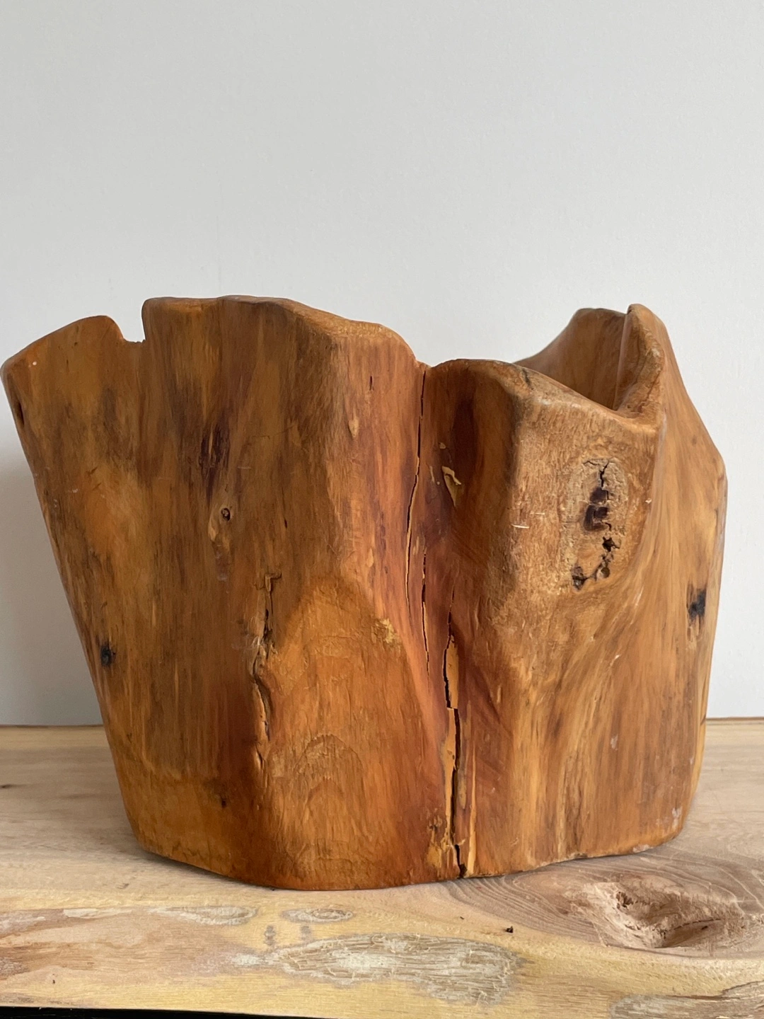 I'm selling a unique wooden root bowl! It's a beautiful, natural piece that would look great as a decorative item in any room. It's made of wood and has a lovely natural finish