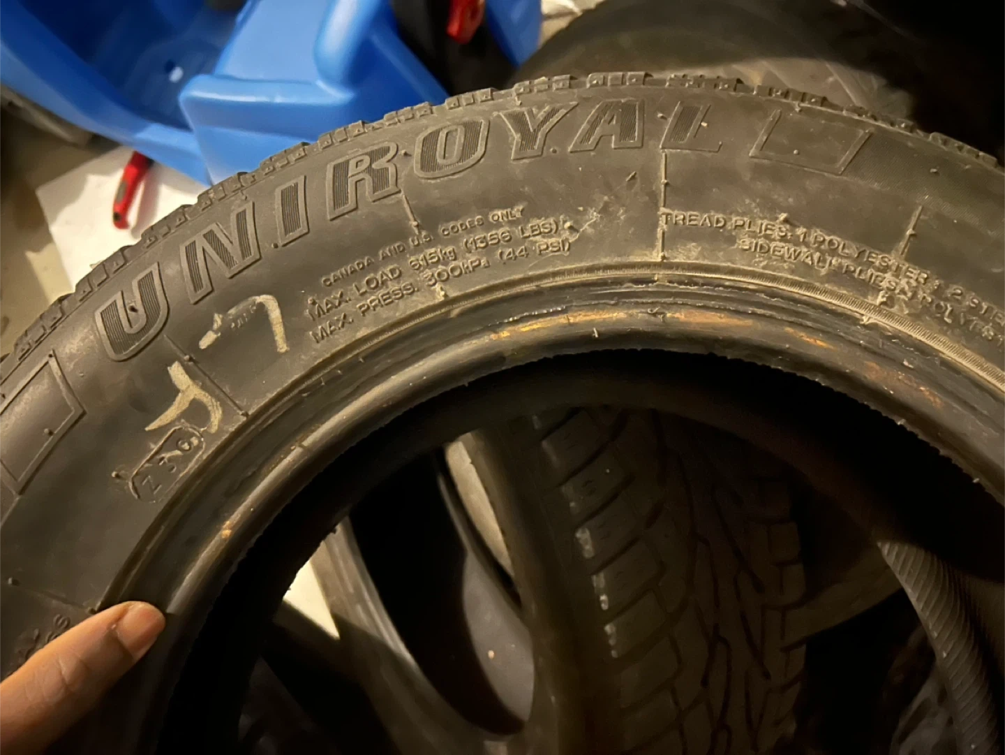Selling a set of four Uniroyal winter tires. They're in good condition and ready to keep you safe on the roads this winter! Check out the photos for tread details and markings.
