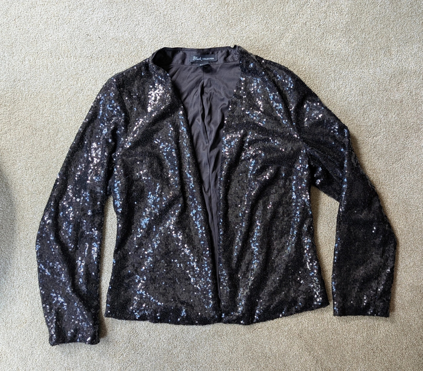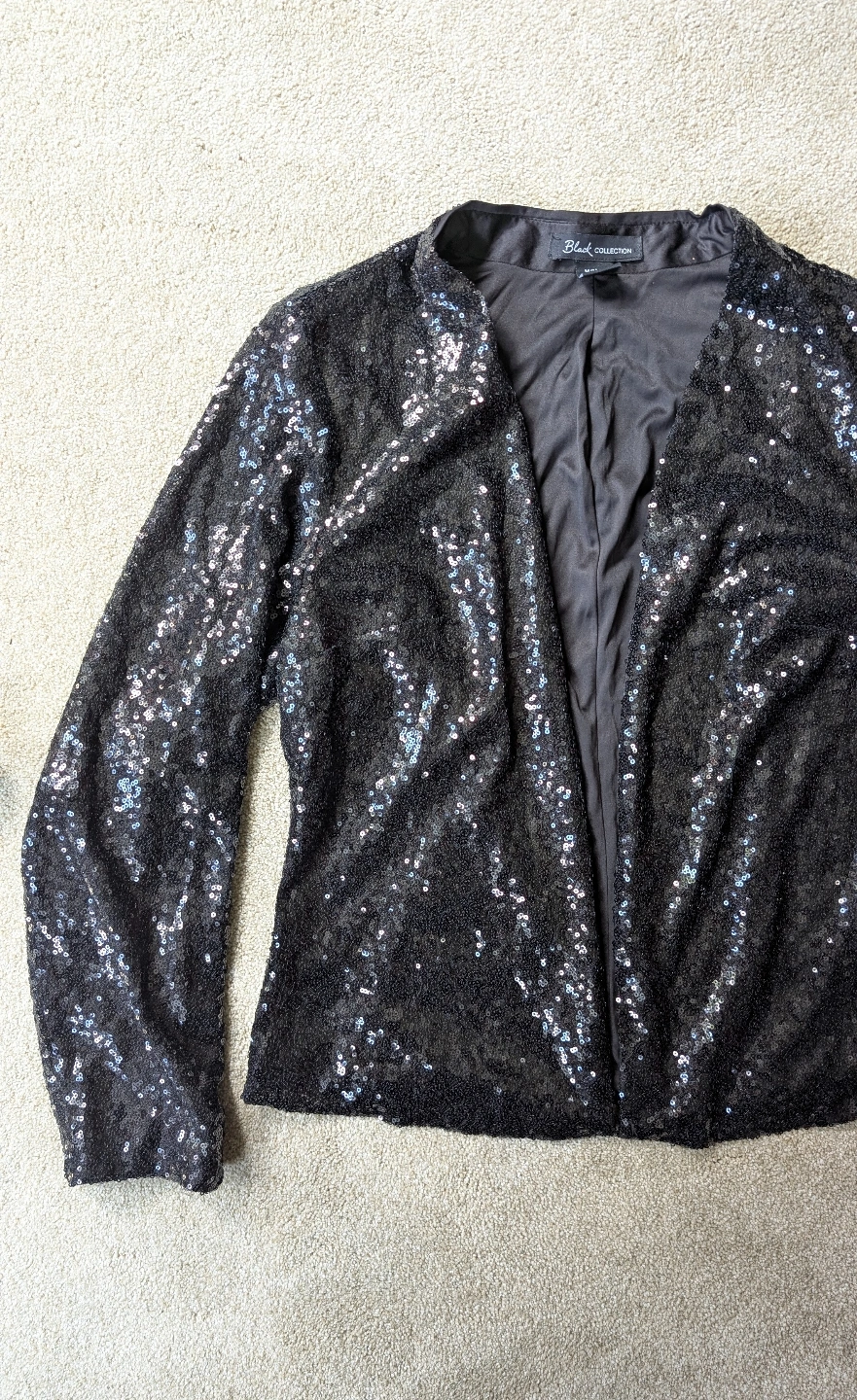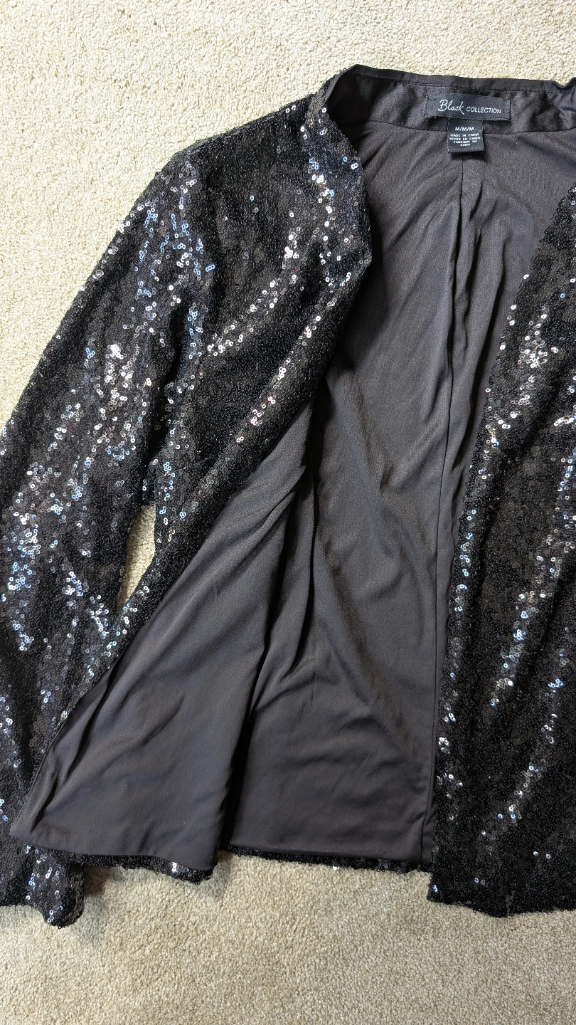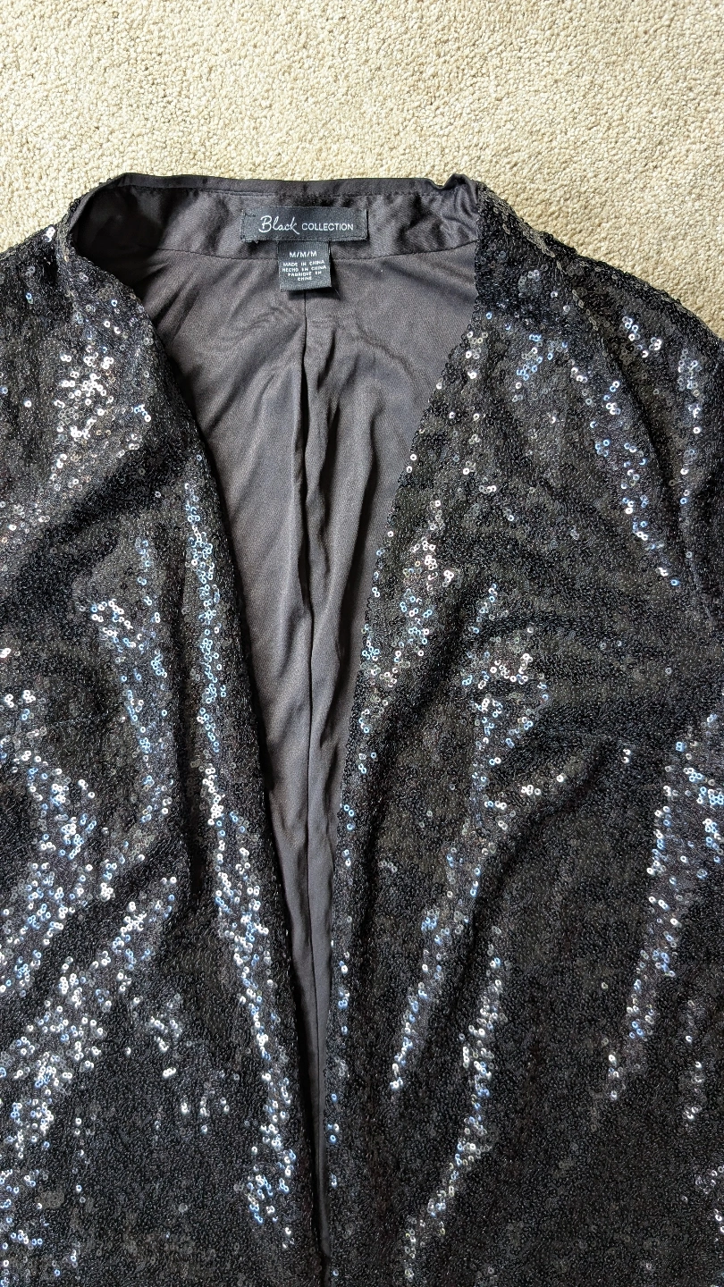 86Unique black sequin blazer. Long sleeves and lined. Open front design. Size medium. Brand new.