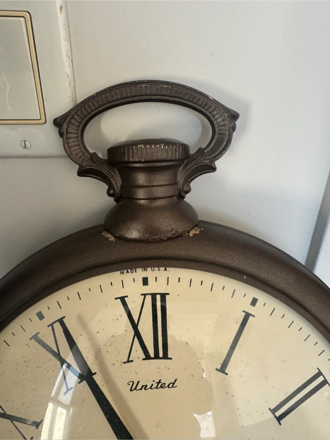 Selling a United pocket watch-style wall clock. It's a unique and stylish piece that would look great in any room. The clock has a bronze finish and a classic design. It's in good condition and keeps accurate time! 17” tall 14” across