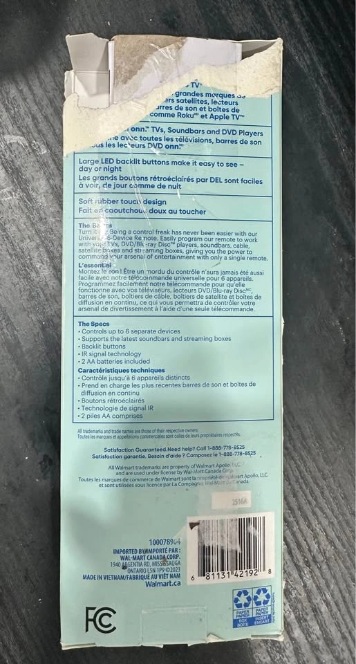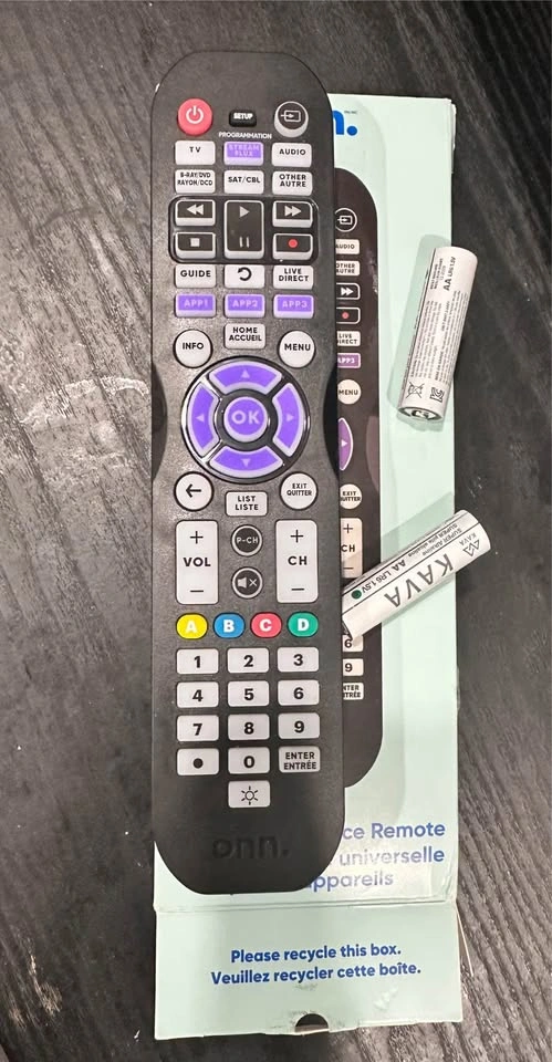 It's brand new in packaging. Easily program our remote to work with your TVs, DVD/Blu-ray Disc players, soundbars, cable, satellite boxes and streaming boxes, giving you the power to command your arsenal of entertainment with only a single remote. Works with all major brand TVs, cable, satellite boxes, DVD/Blu-ray Disc players, soundbars and streaming boxes such as Roku and Apple TV. Works with all onn TVs, Soundbars and DVD Players. Large LED backlit buttons make it easy to see – day or night. Soft rubber touch design. Controls up to 6 separate devices. IR signal technology; 2 AA batteries included. Packing is little damage as you can see pictures but item is brand new. Pickup only @ Glynn rd ajax. Please check my other ads aswell pickup only harwood and kingston ajax thanks