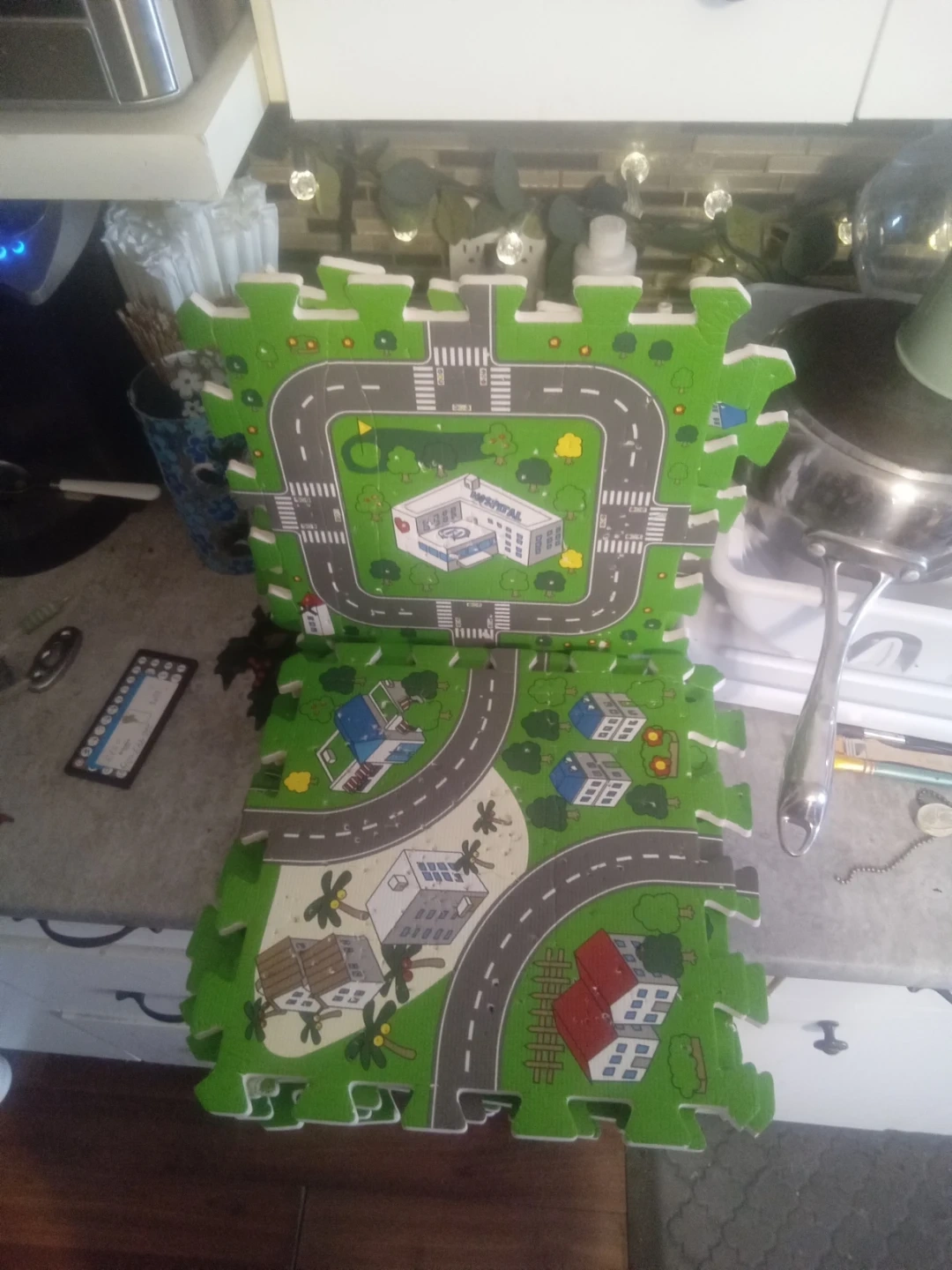 Interlocking foam play mat featuring a city scene with roads, buildings, and a hospital. Perfect for children's play areas. Easy to assemble and clean.some wear and tear from use